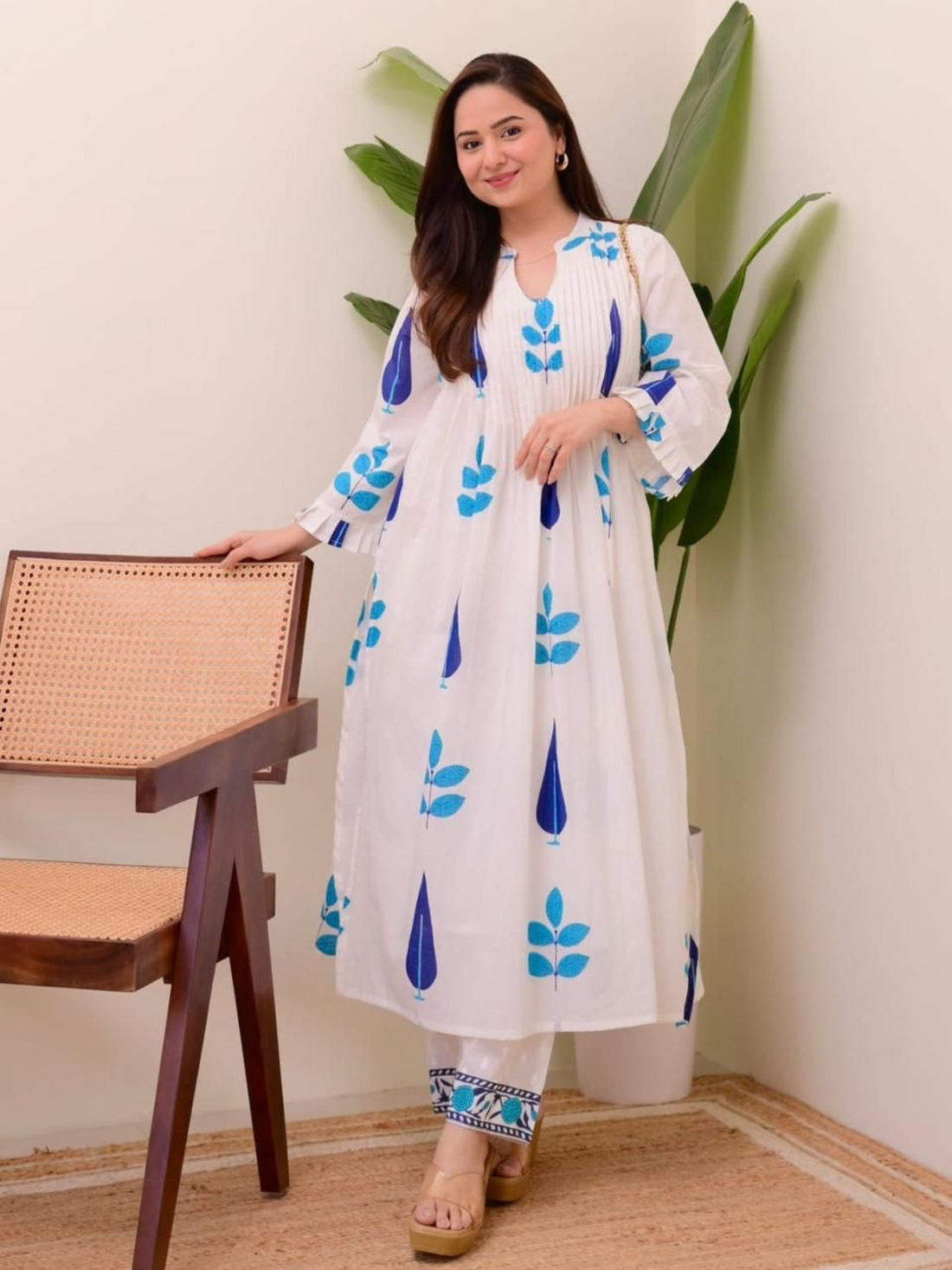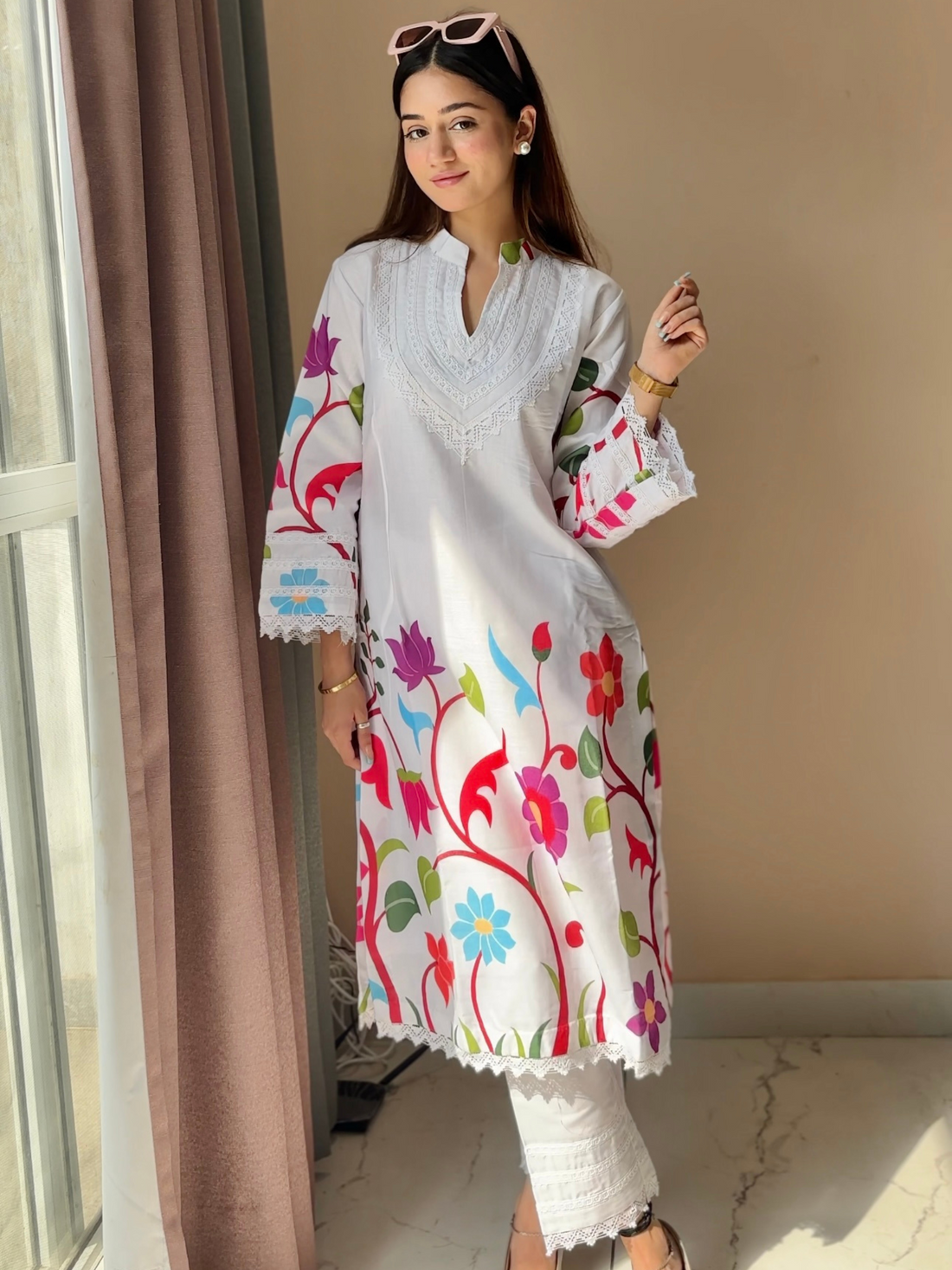 Cotton Linen Kurta Set Mesmerize White Floral Print
