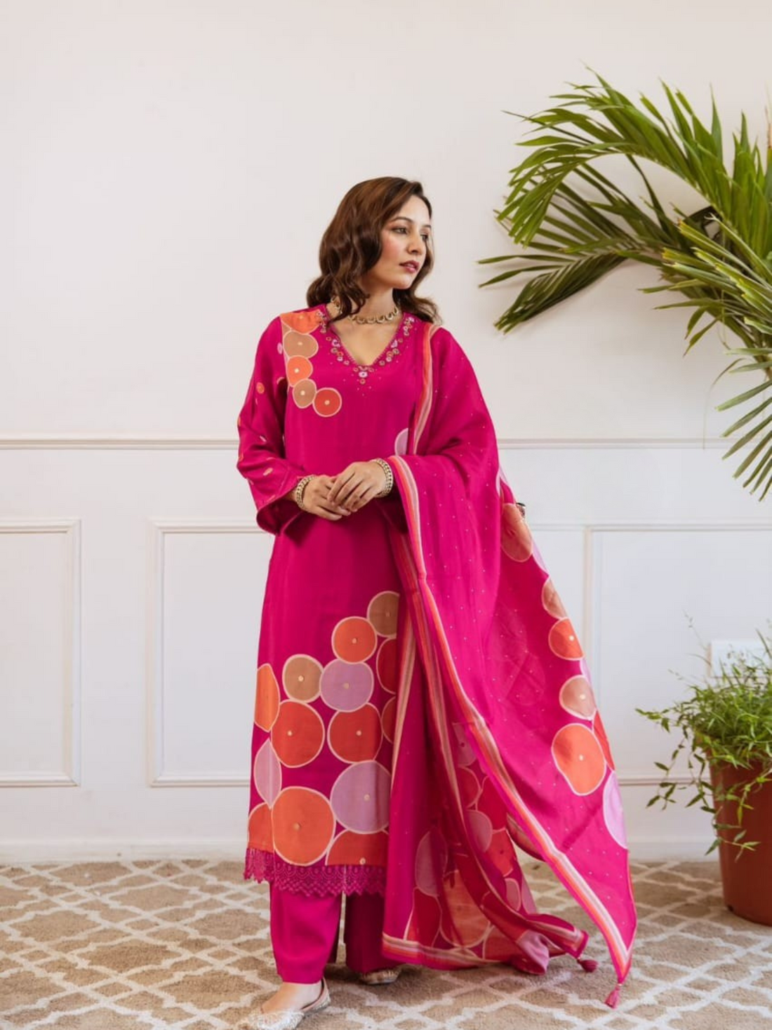 Premium Modal Silk Digital Printed with Embroidered Suit Set-Pink