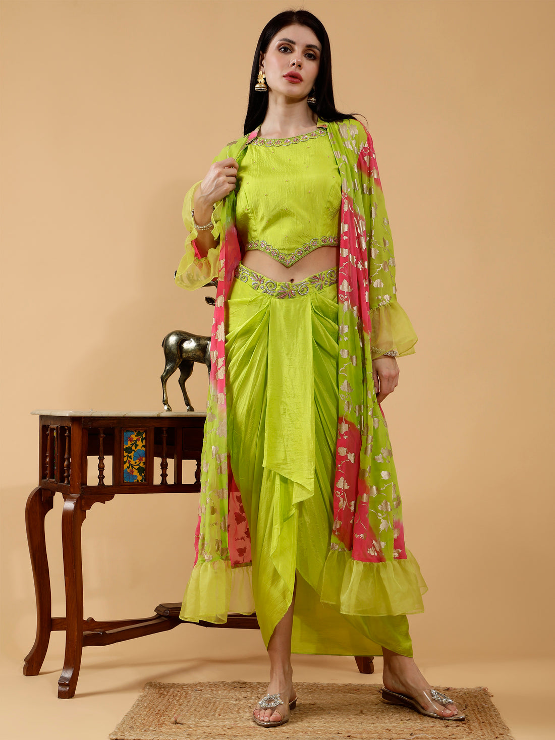 Silk Bhairavi Green Hand Embroidered Dhoti Drape Skirt With Crop Top & Shrug