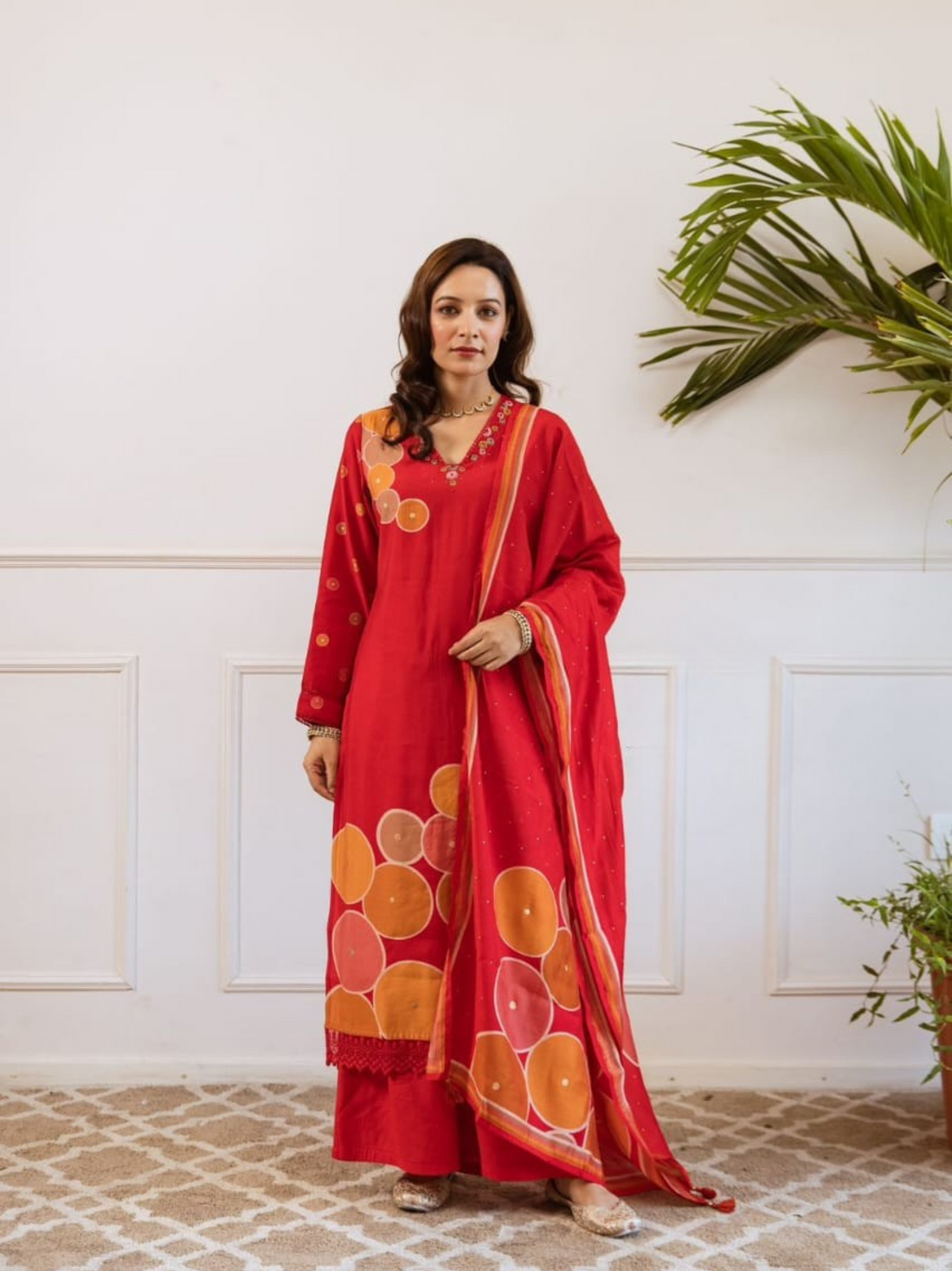 Premium Modal Silk Digital Printed with Embroidered Suit Set-Red