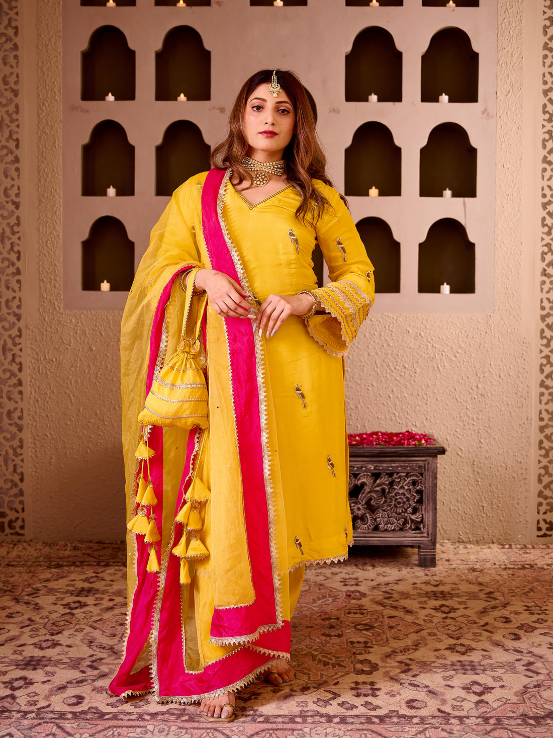 Panchi Yellow Silk Hand Embroidered Suit Set