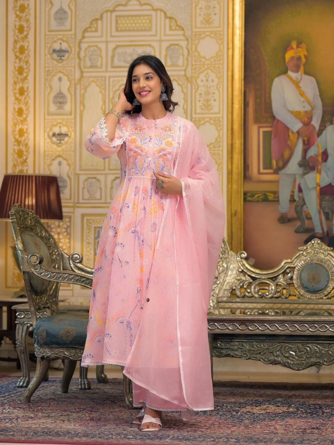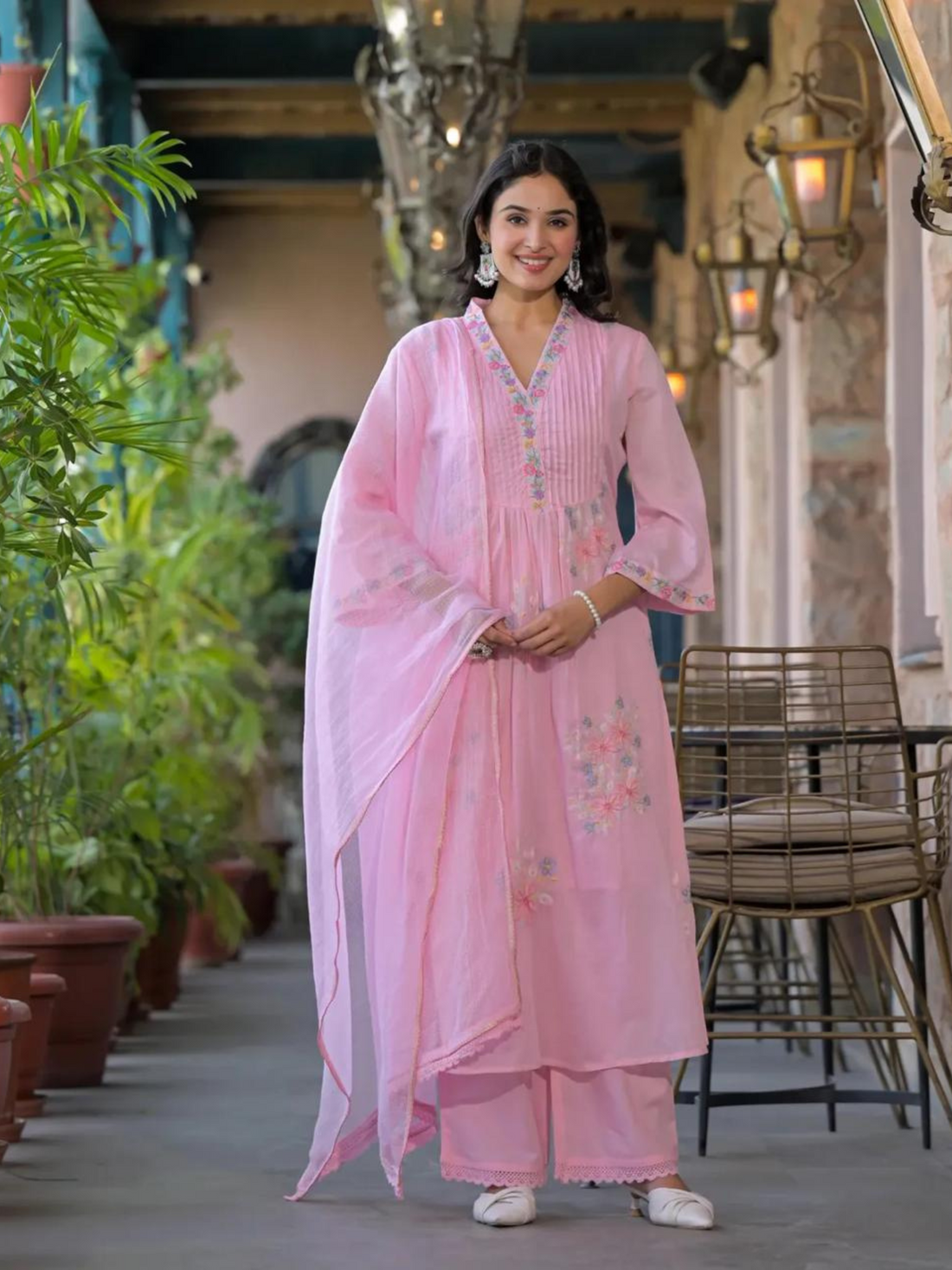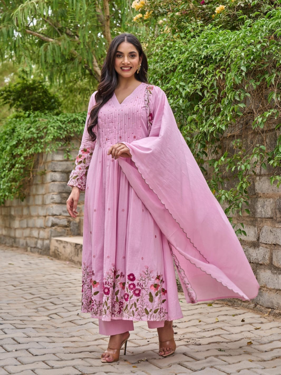 Premium Pink Mul Cotton A-Line Suits With Embroiderd