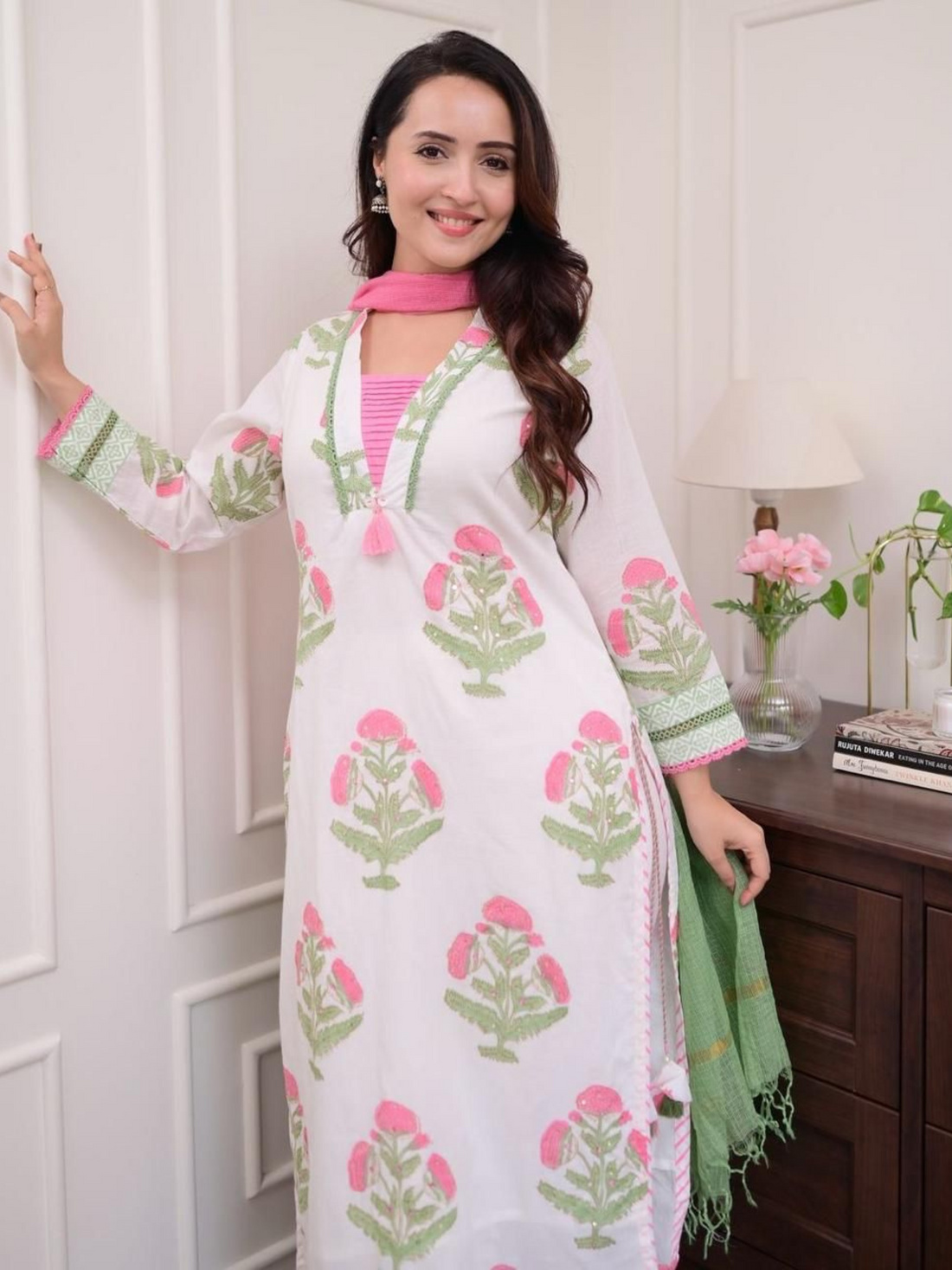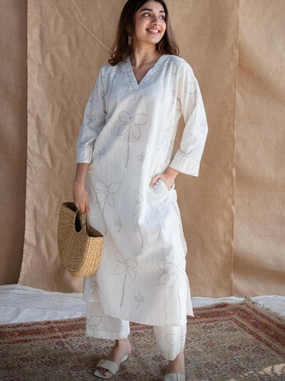 WHITE & GREEN FLORAL 2 PIECE LINEN KURTA SET