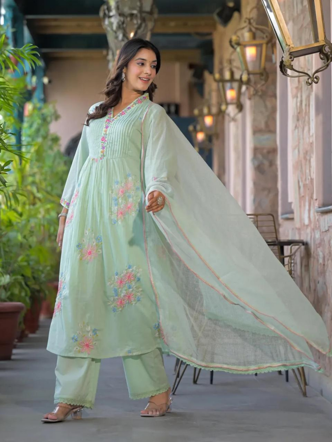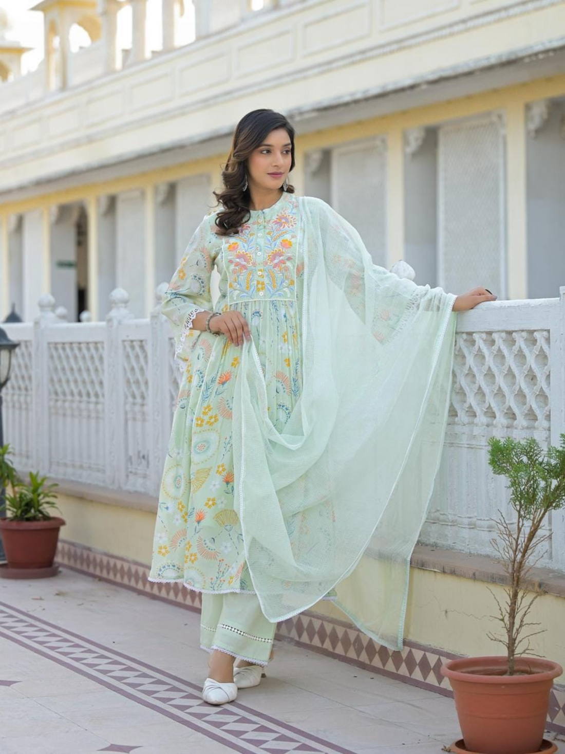 Premium Pure Cotton Digital Printed Embroidery Suits-Light Green