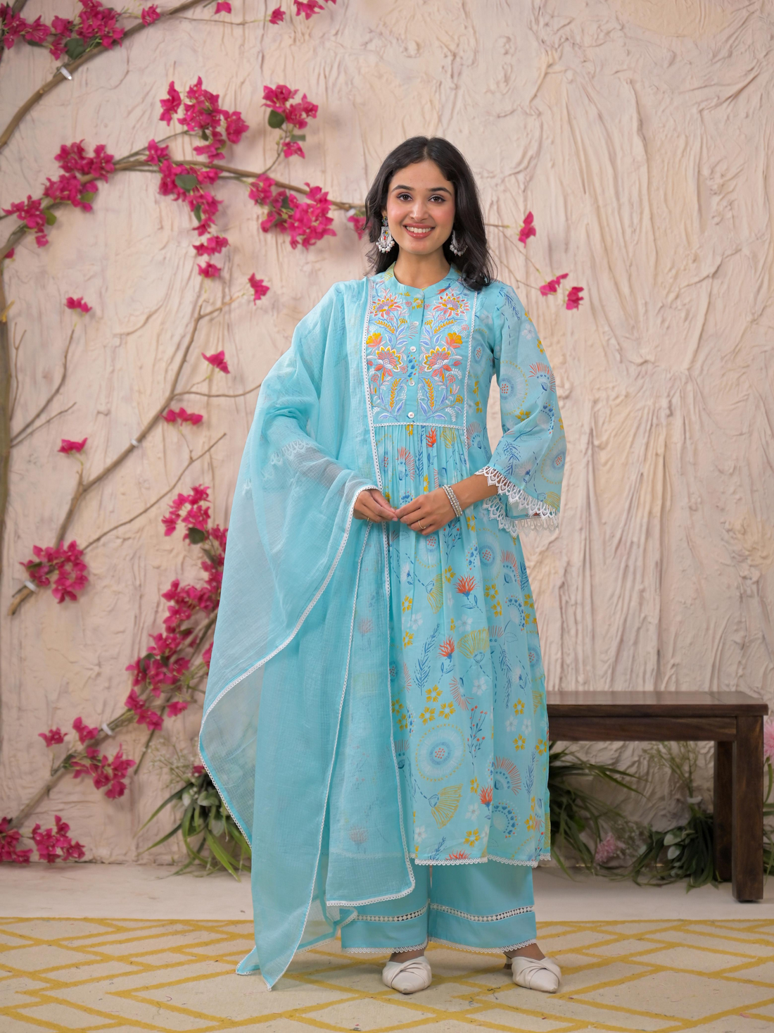 Premium Pure Cotton Digital Printed Embroidery Suits-Light Blue