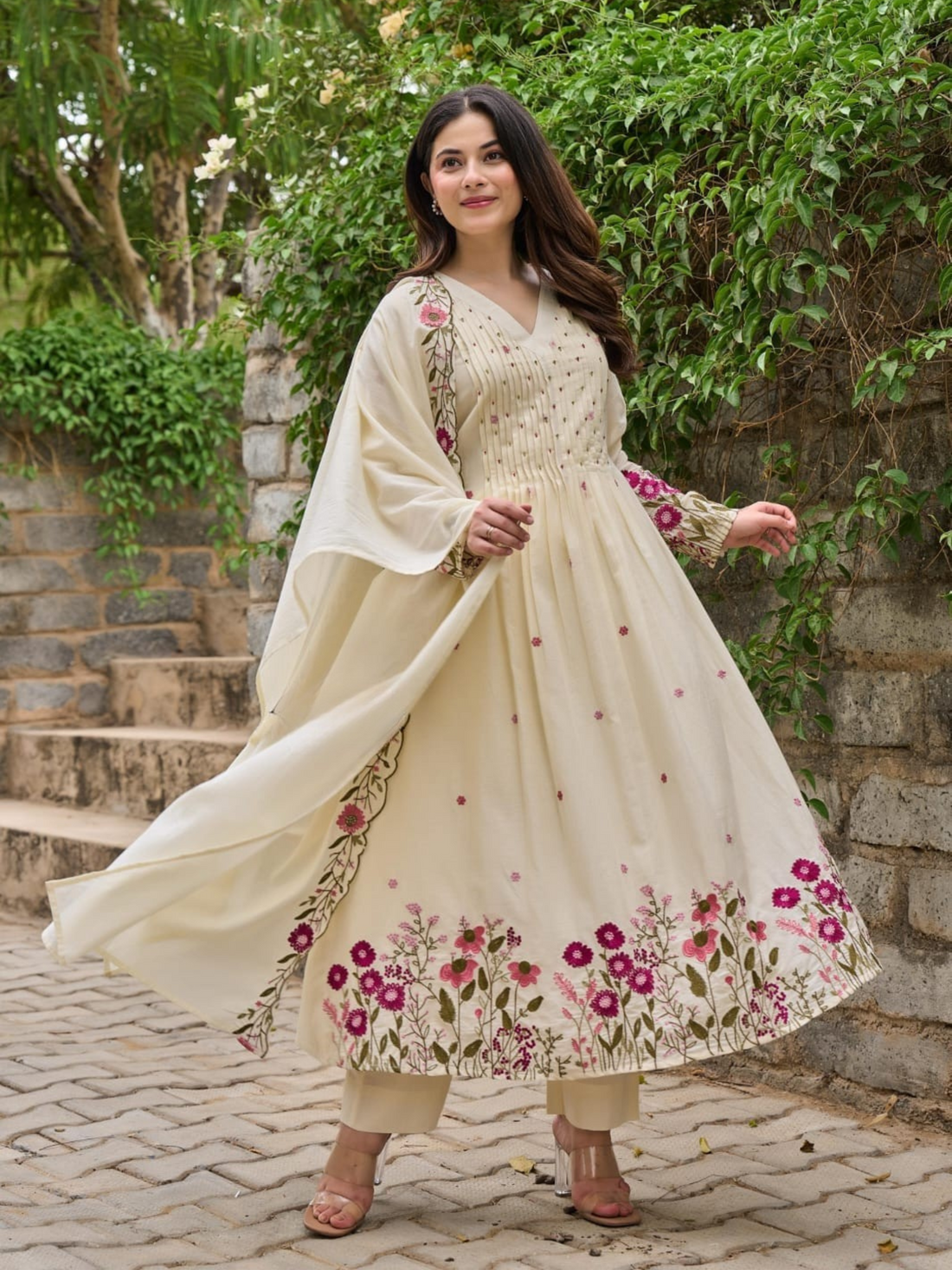 Premium Cream Mul Cotton A-Line Suits With Embroiderd