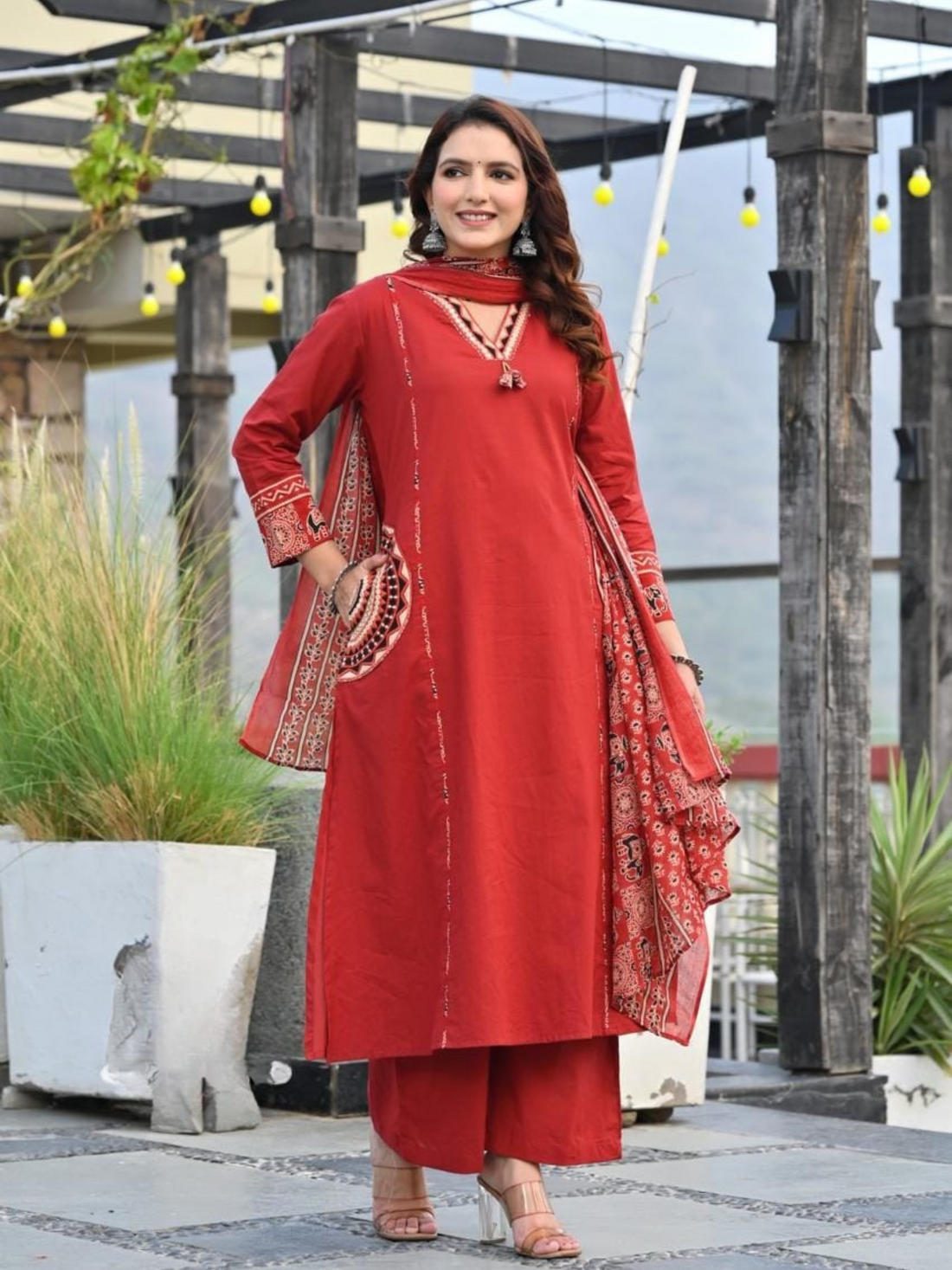 Red Pure Cotton Embroided Suits with Designer Pocket