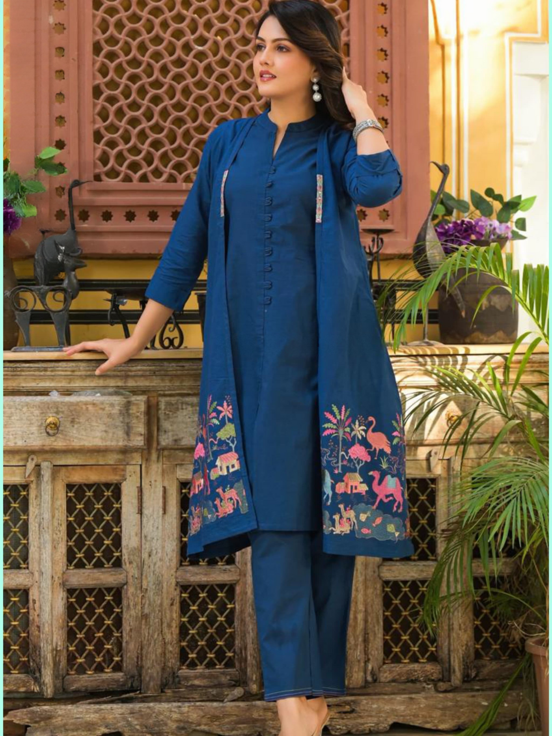 Three Pc Cotton Shurg Set with Thread & Embroidery Work-Blue
