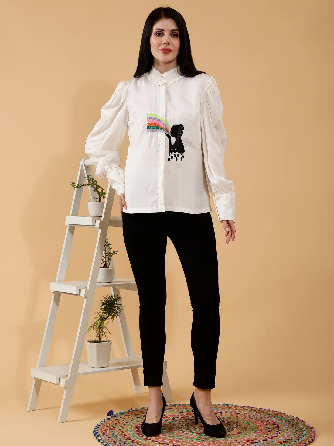 SILK WHITE RAINBOW HAND EMBROIDERED SHIRT