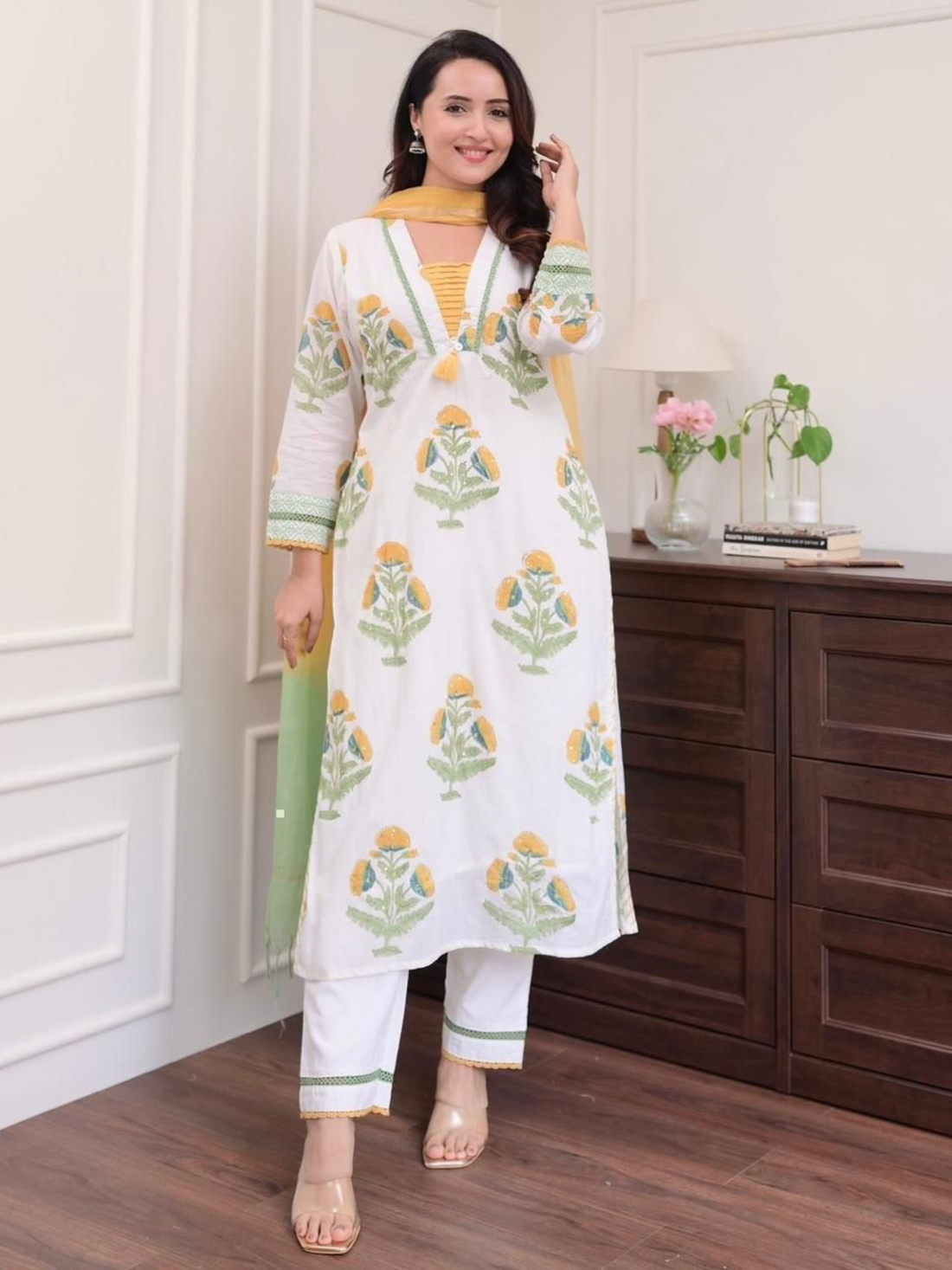 Pure Cotton Yellow White Floral Printed 3PC Suit Sets