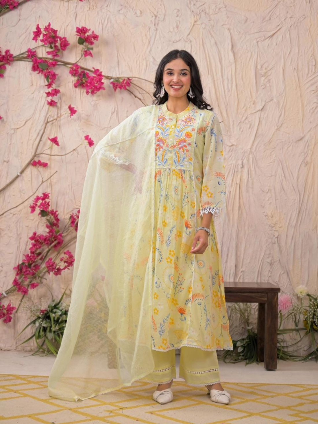 Premium Pure Cotton Digital Printed Embroidery Suits- Yellow