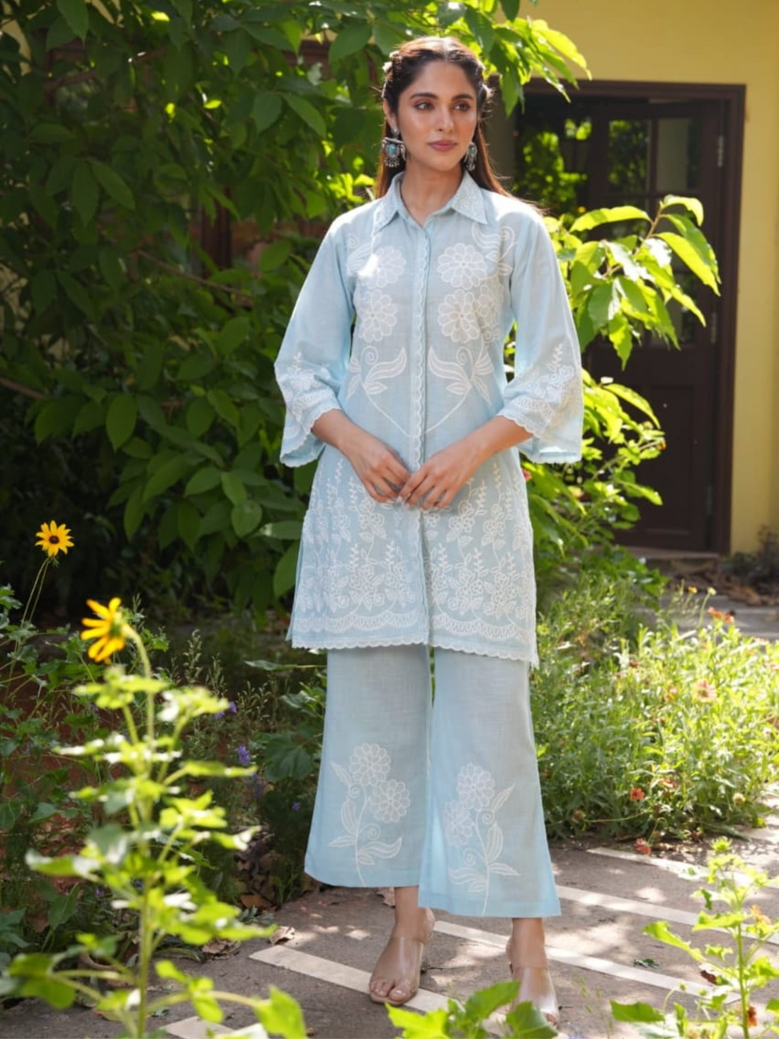 Premium Cotton Schiffili Work Co-Ord Set-Blue