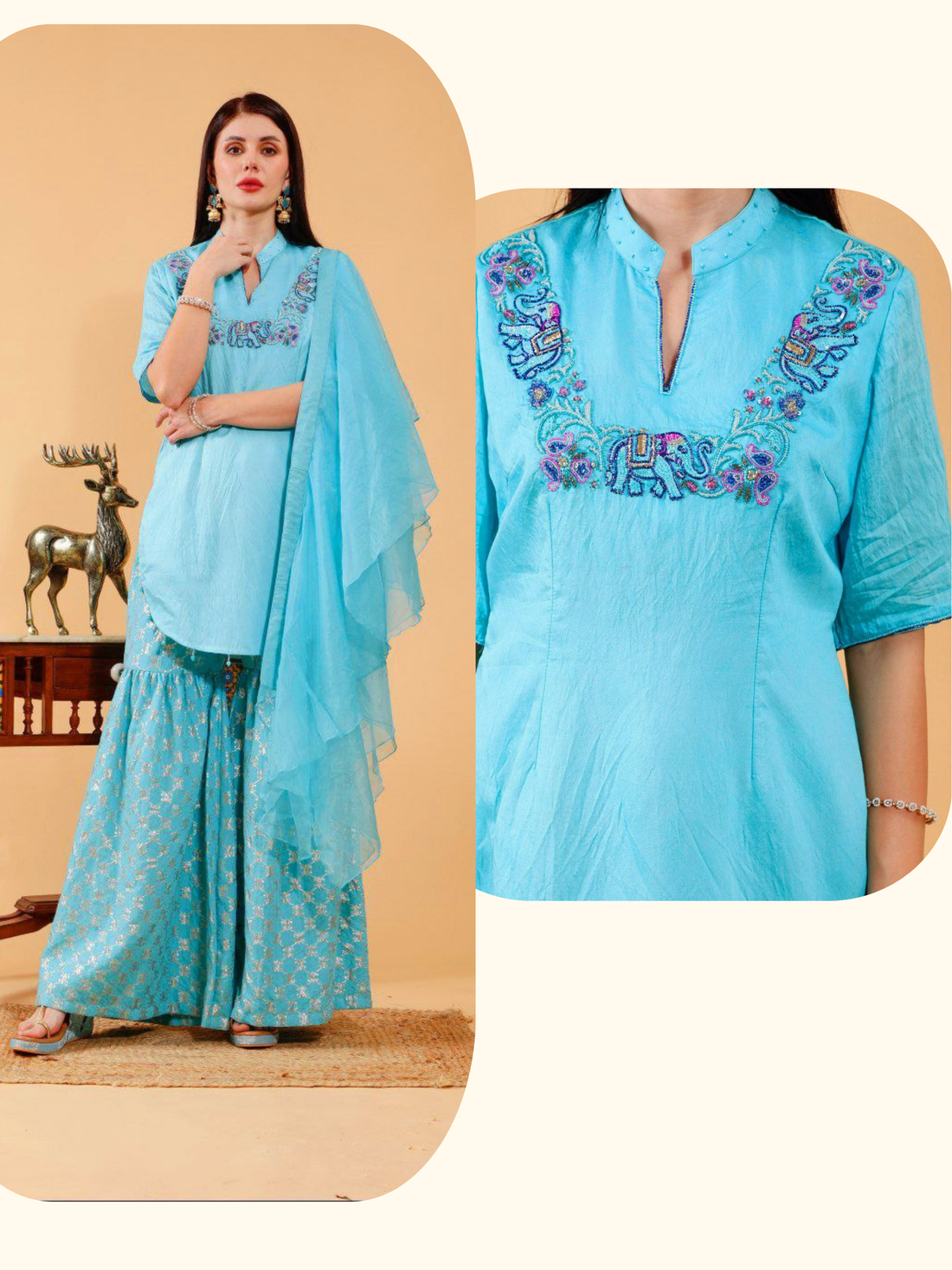 PRODUCT SKU: PNP00105 DESCRIPTION: COLOR: Sky BlueFABRIC: Top-Uppada Silk, Garara-Banarasi silk LENGTH OF TOP: ...