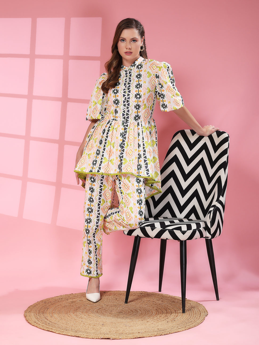 Product Code- PNPS2445 DESCRIPTION- This co-ord in white base color and an alluring abstract print...
