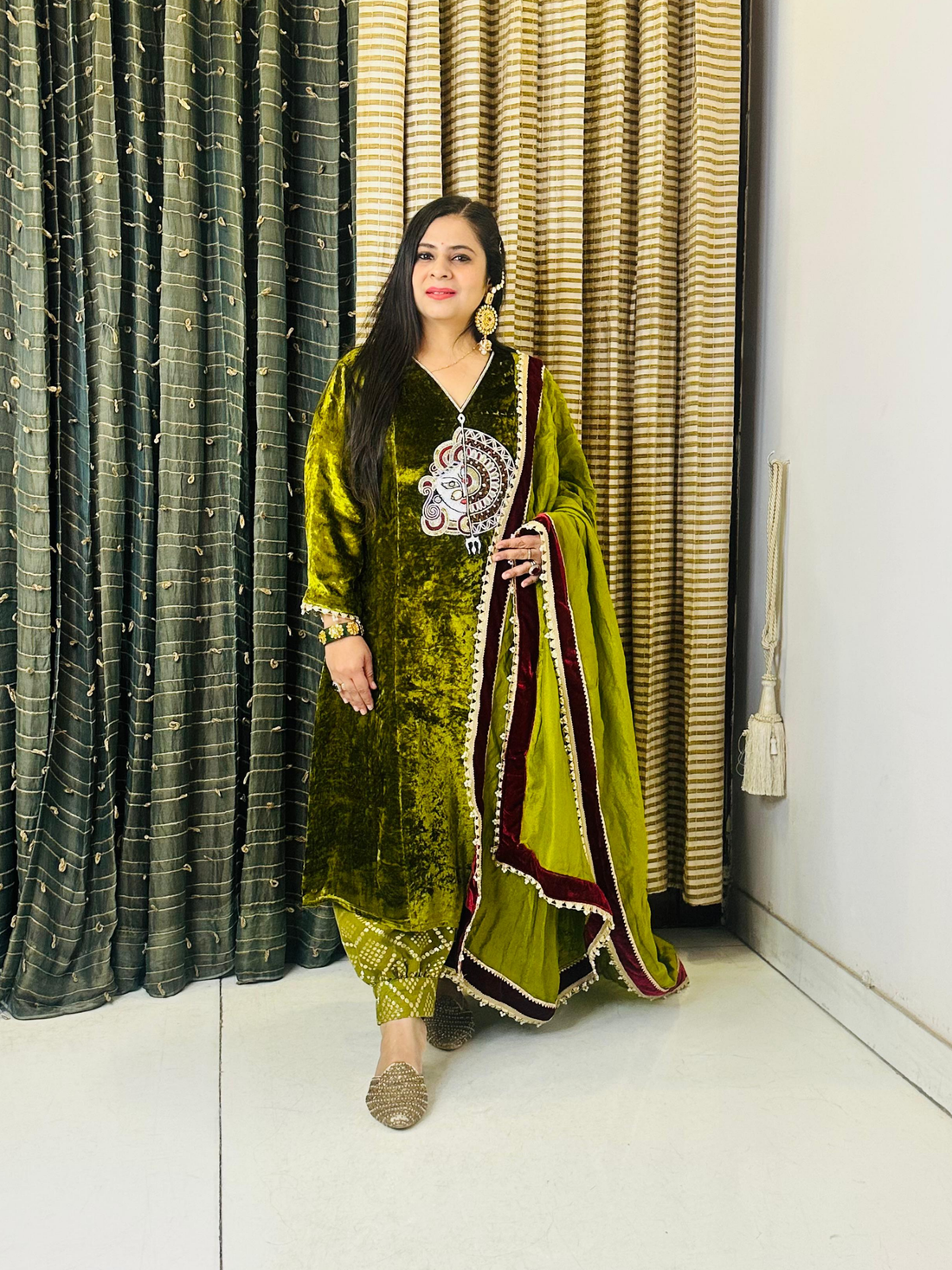 Product Sku- PNPWV2557 Fabric - Micro Velvet 9000 & Chanderi BrocadeColor- Heena GreenLength Of Kurta-...