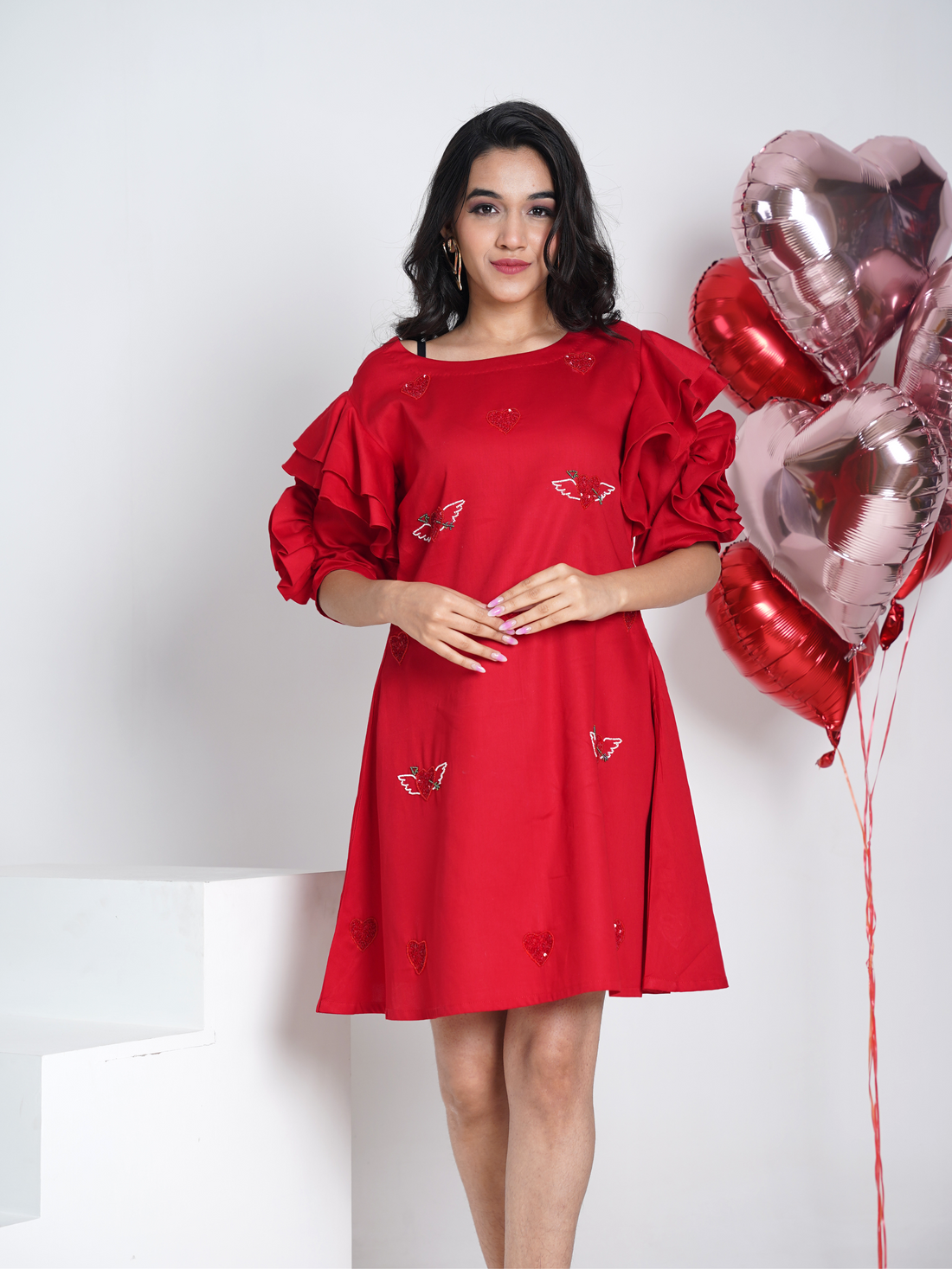 Heartilicious Red Embroidered Pure Cotton A- shape dress