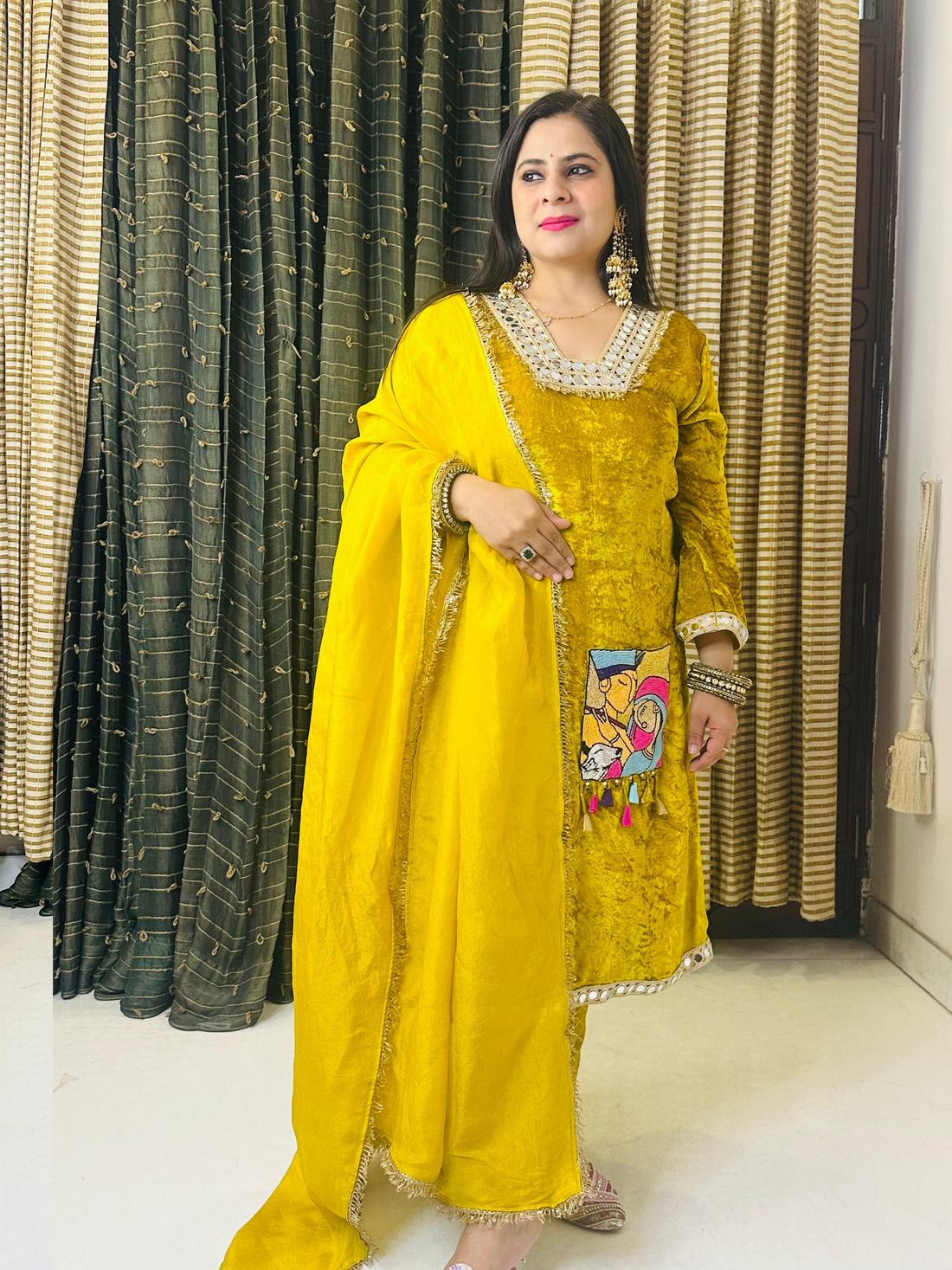 Product Sku- PNPWV2562 Fabric - Velvet & Chanderi BrocadeColor- Mustard YellowLength Of Kurta- 42 InchesLength...