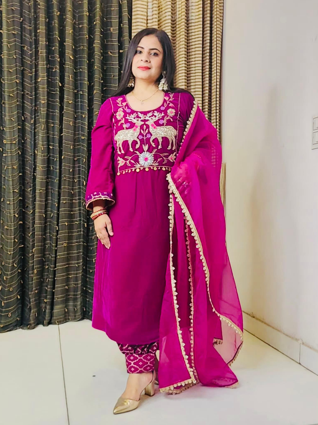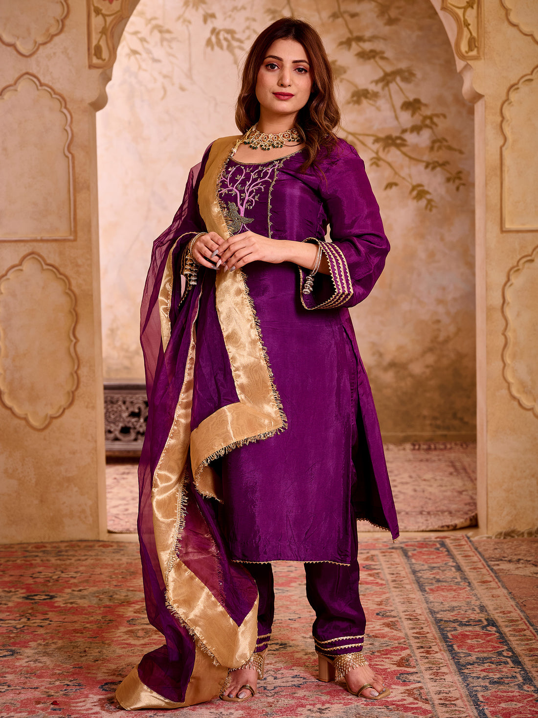 Krishika Purple Silk Vrindavan Themed Hand Embroidered Suit Set