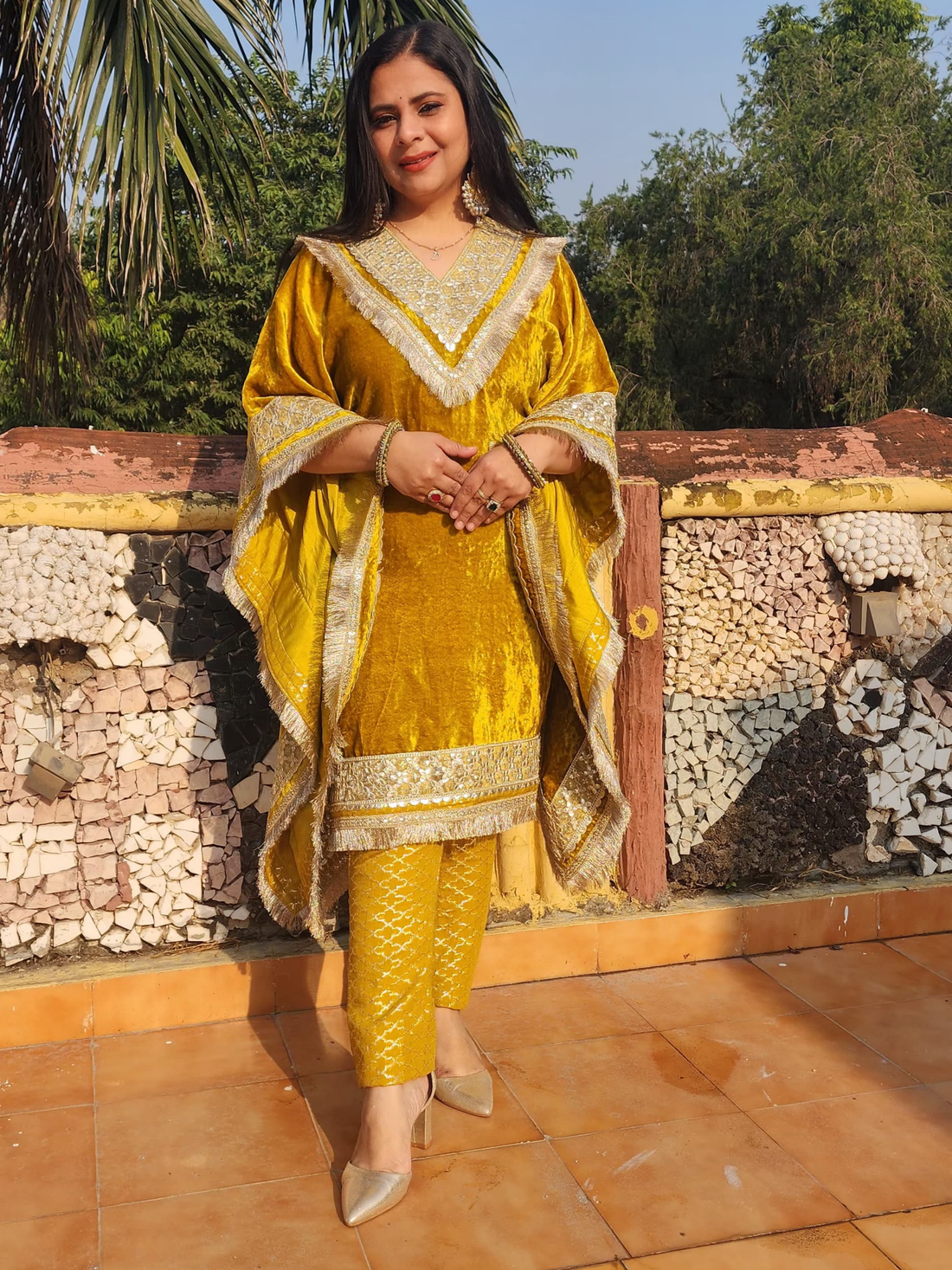 Product Sku- PNPWV2552 Fabric - Micro Velvet 9000 & Chanderi BrocadeColor- MustardLength Of Kaftan- 42...