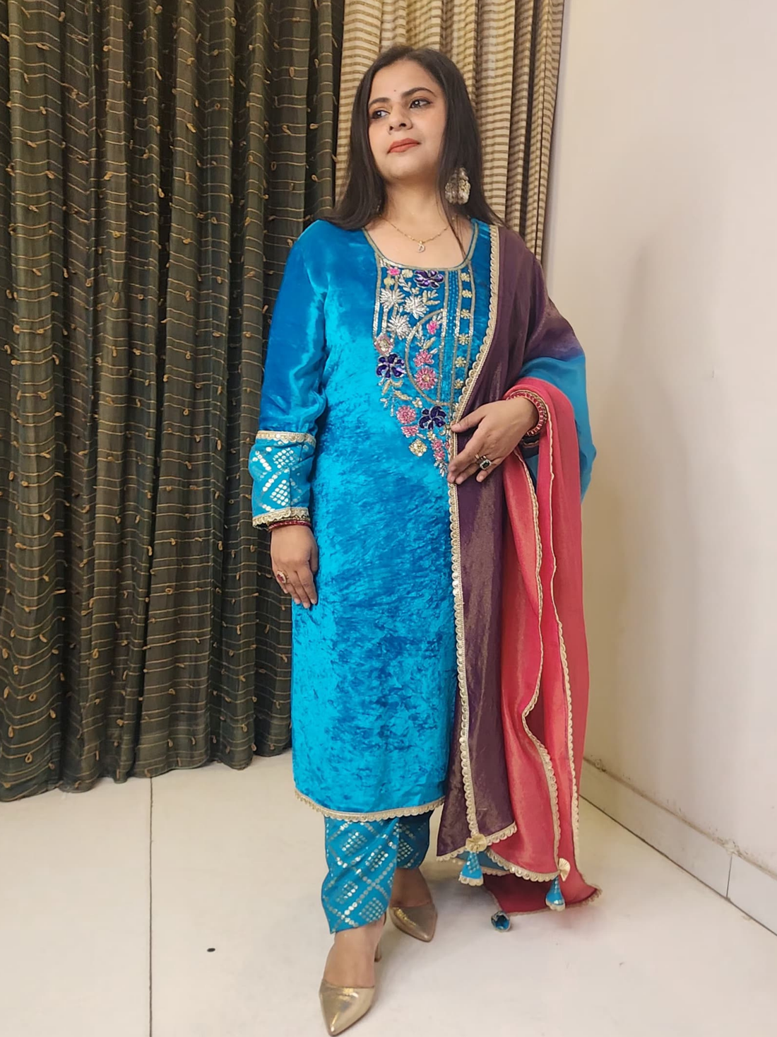 Product Sku- PNPWV2554 Fabric - Micro Velvet 9000 & Chanderi BrocadeColor- Turquoise BlueLength Of Kurta-...