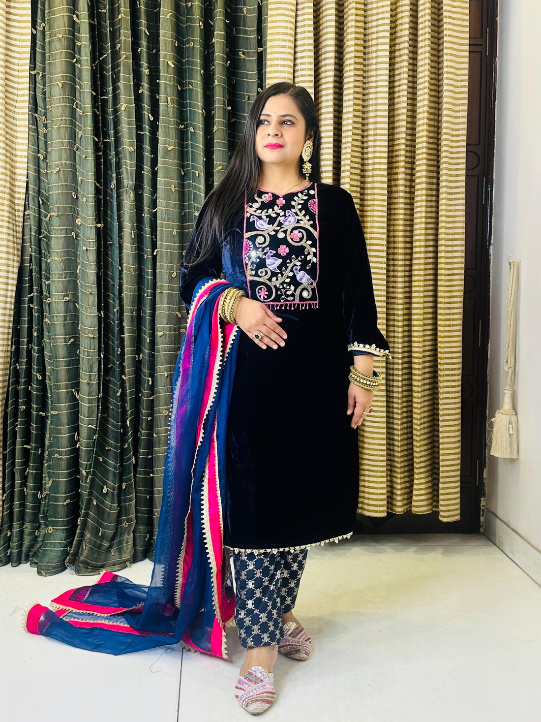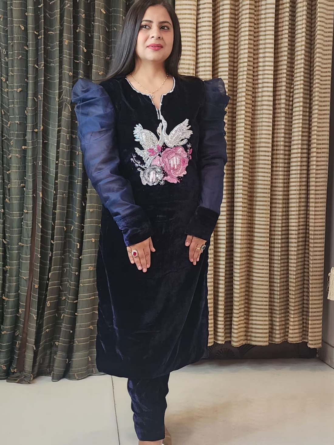 Navy Blue Hand Embroidered Velvet Kurta Set
