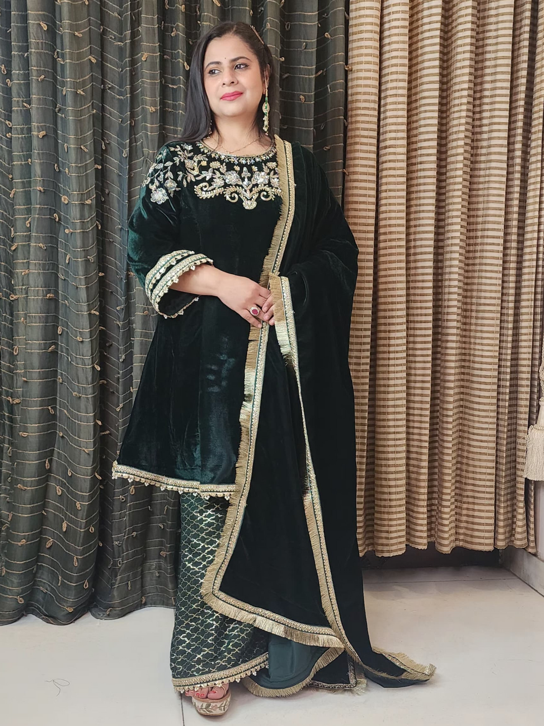 Bottle Green A Line Hand Embroidered Velvet Suit With Sharara