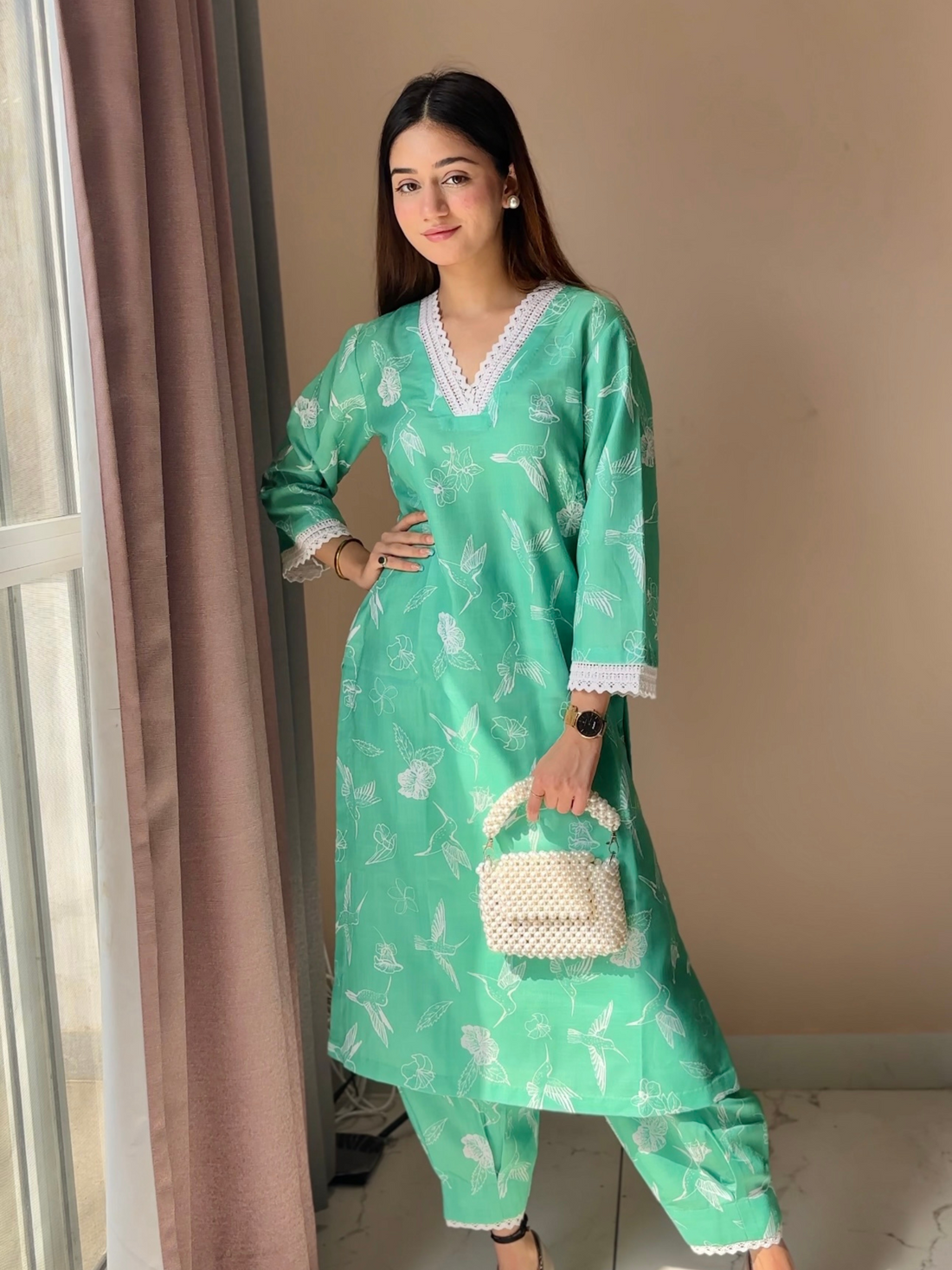 Product Code- PNPS2420 DESCRIPTION- This kurta set in beautiful green color and an alluring bird...
