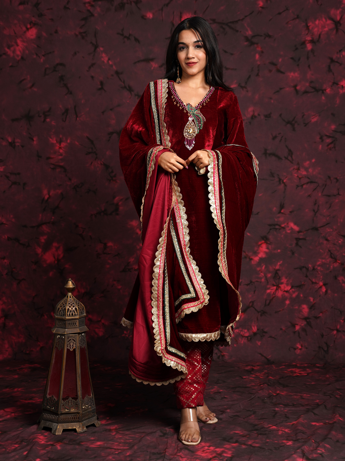 Ruby Red A Line Hand Embroidered Velvet Suit