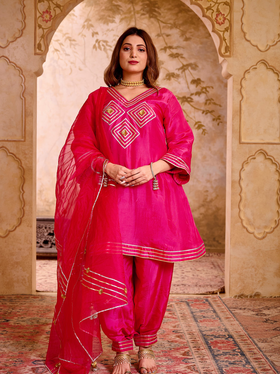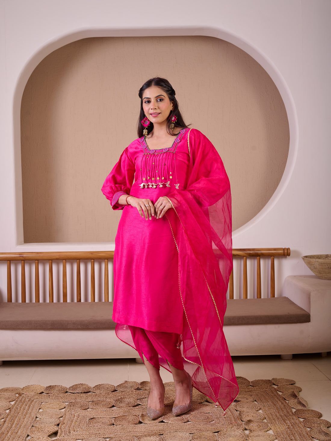 Fuchsia Pink Raw Silk Suit With Hand Embroidery