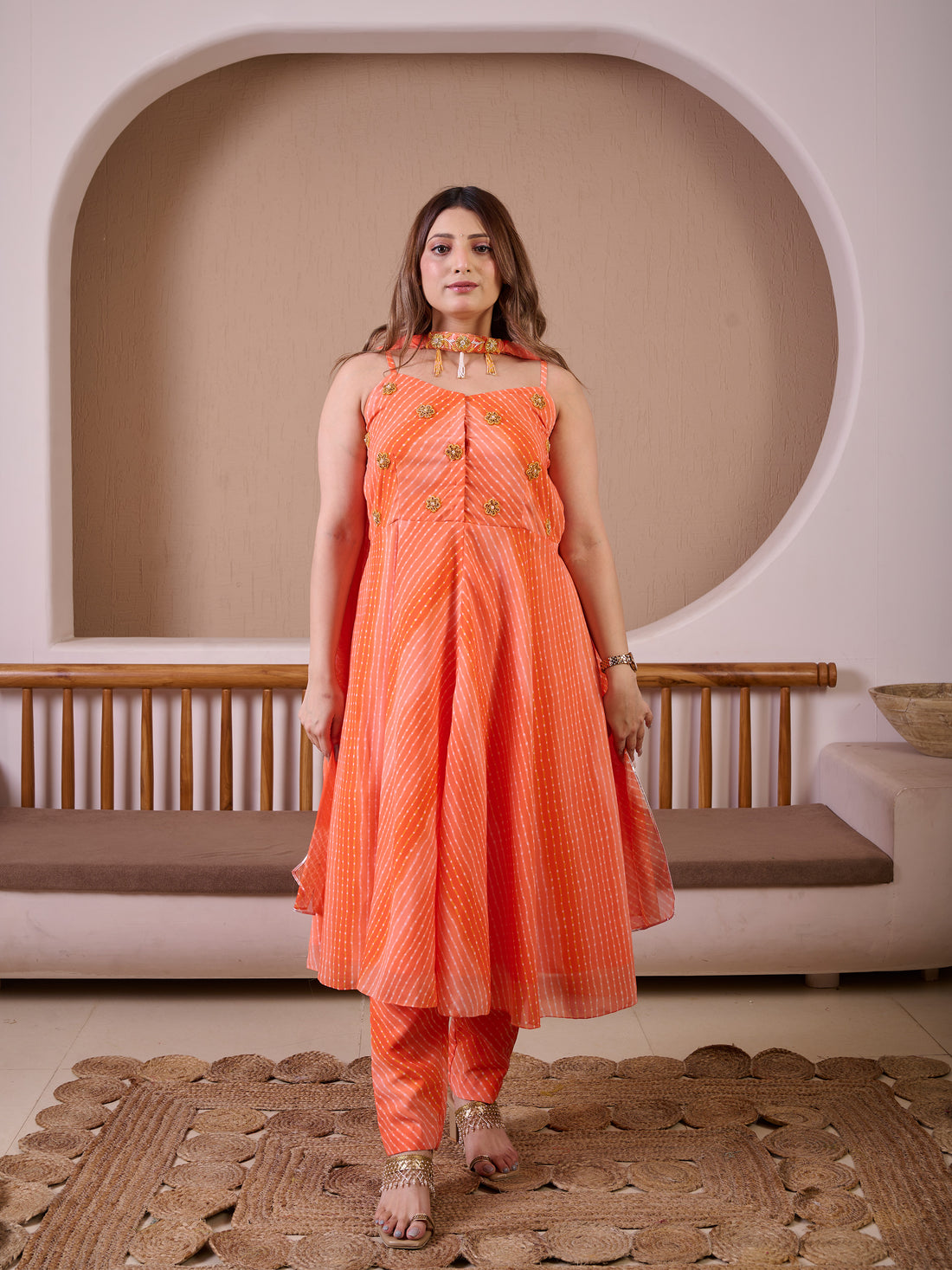 Tangy Orange Ombre Leheriya Hand Embroidered Suit Set With Choker Style Dupatta