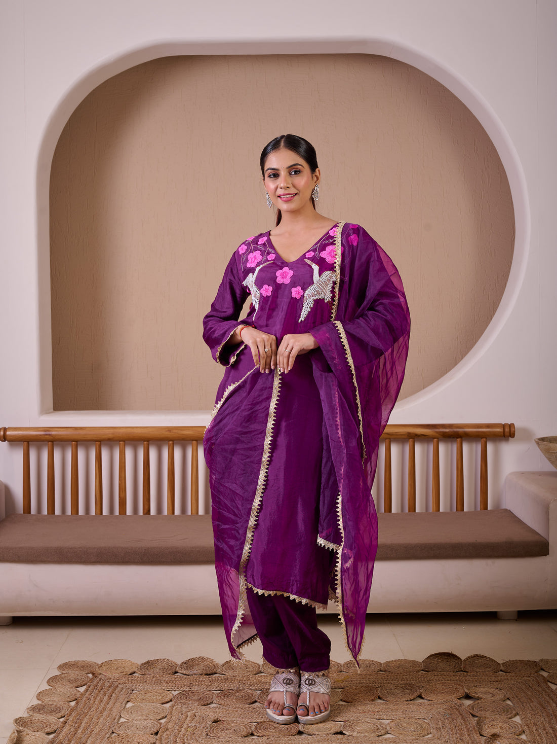 Flying Flamingo Purple Silk Hand Embroidered Suit Set