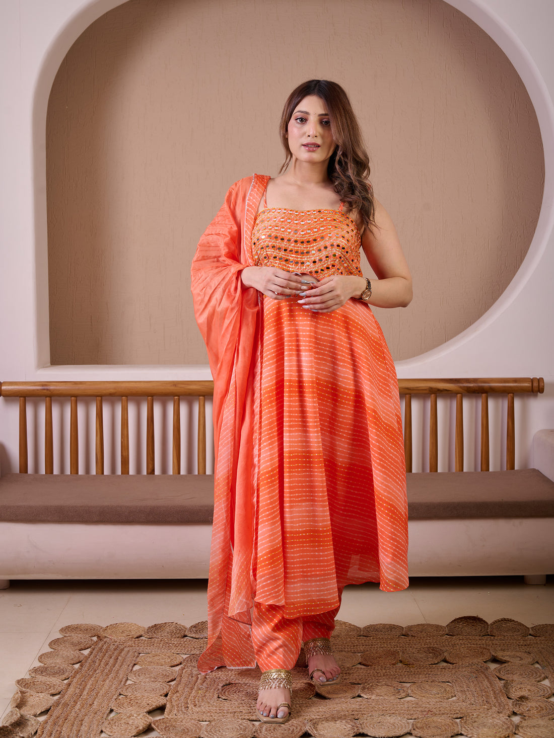 Tangy Orange Ombre Leheriya Hand Embroidered Suit Set With Mirror Work