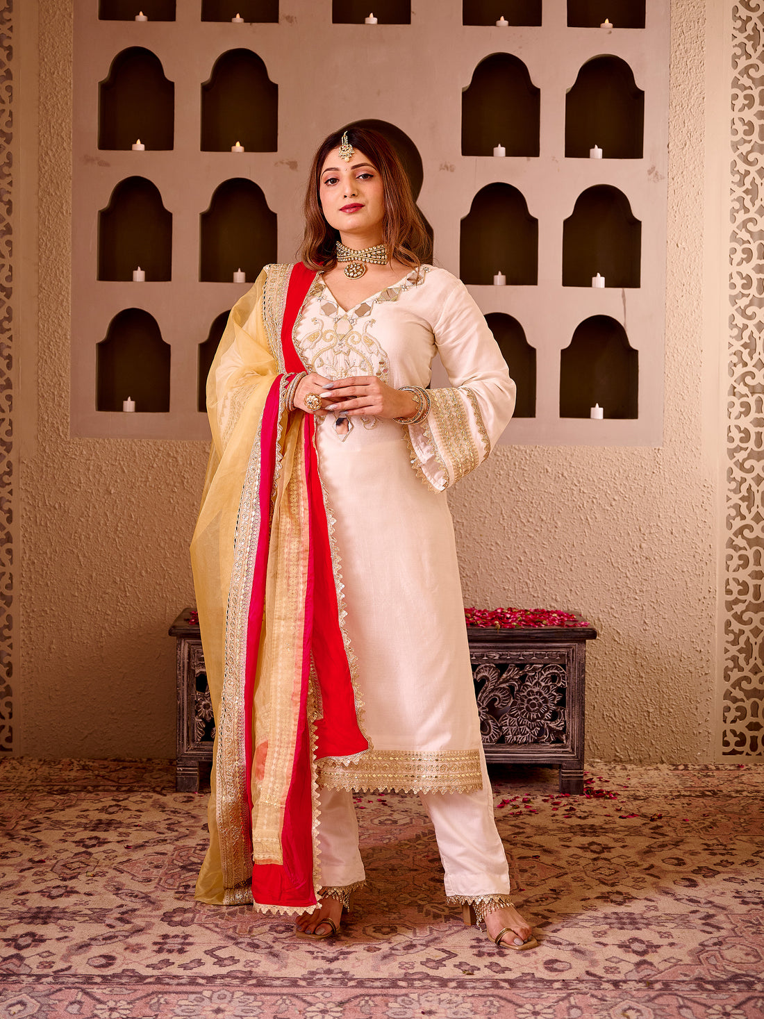 Sheeshmahal Ivory Chanderi Silk Hand Embroidered Suit Set