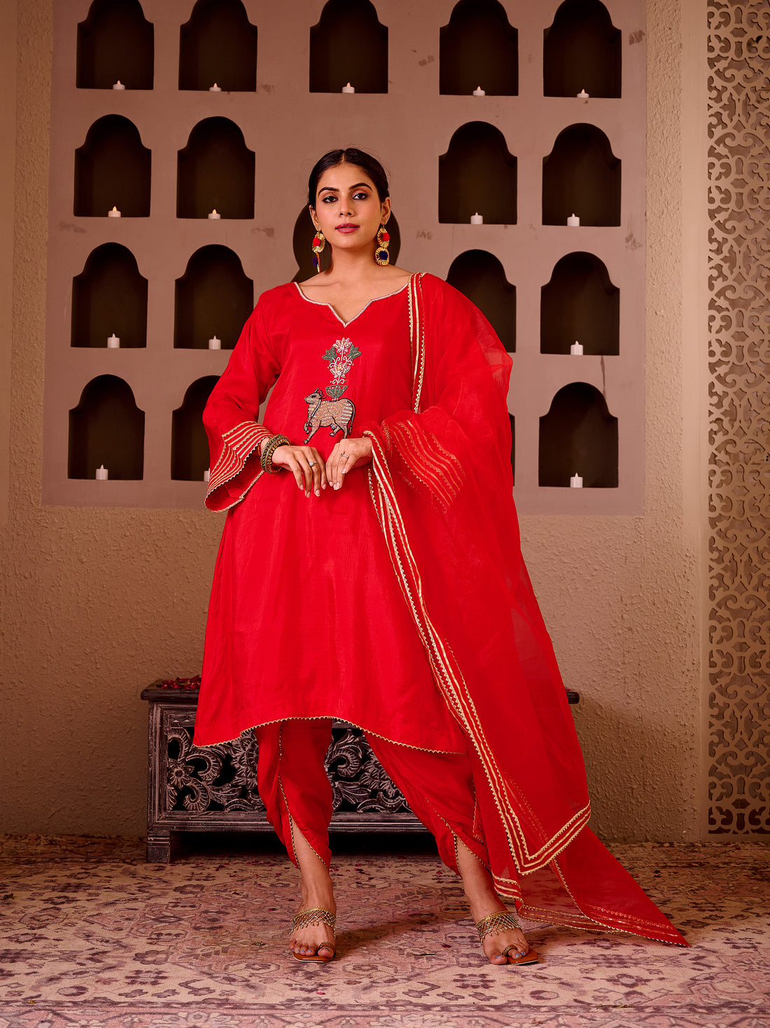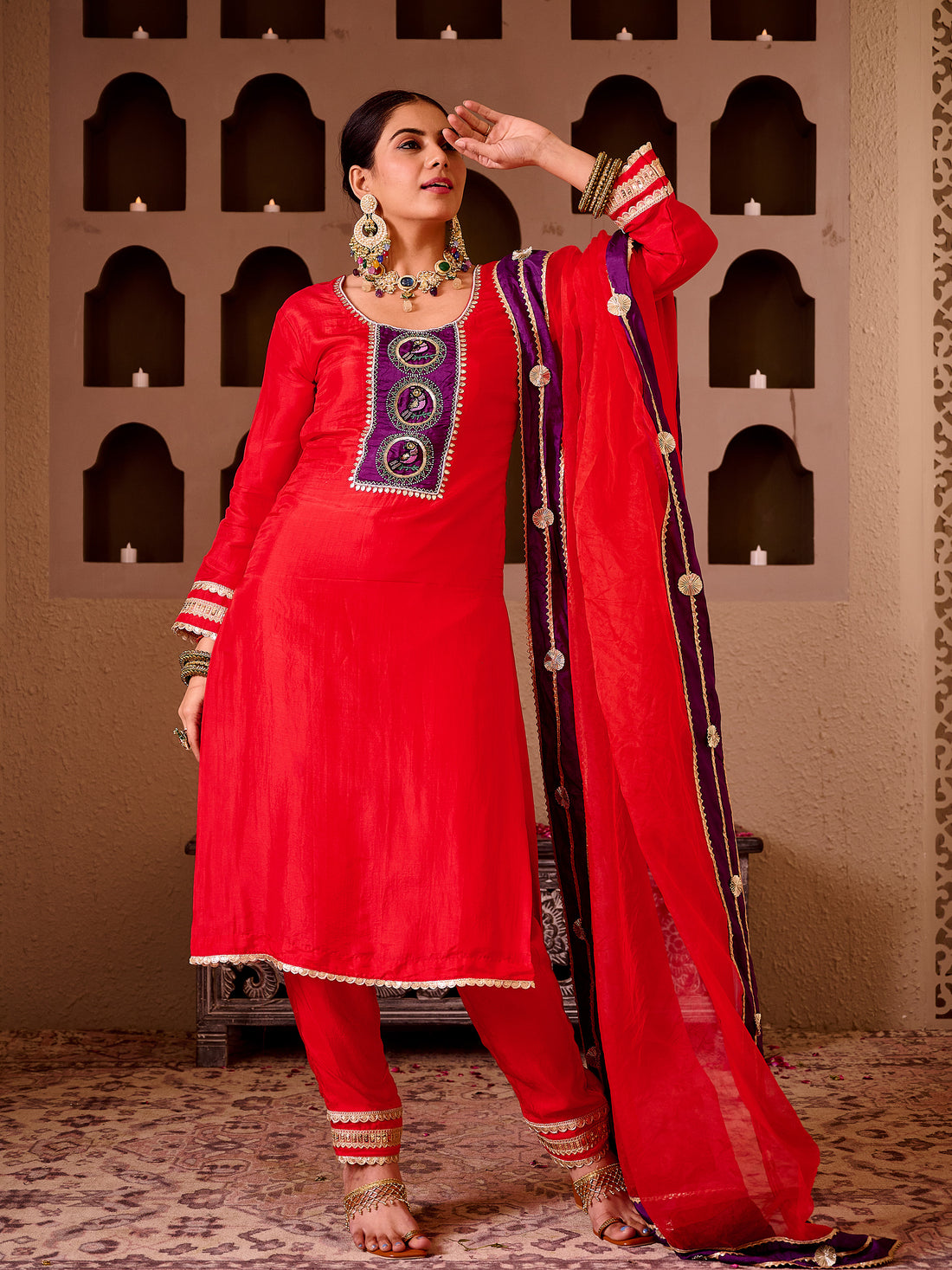 Pichwai Art Red Silk Hand Embroidered Suit Set