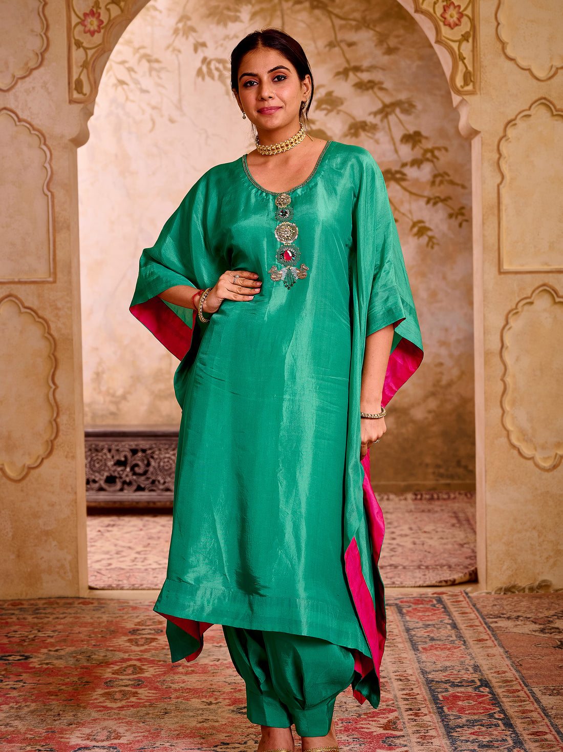 Samragi Emerald Green Silk Hand Embroidered Kaftan Set
