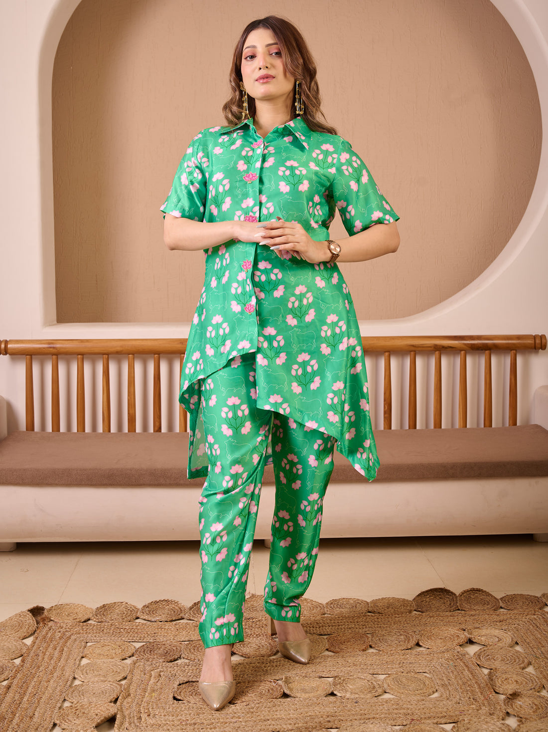 Pichwai Emerald Green Cotton Satin Hand Embroidered Co-ord Set