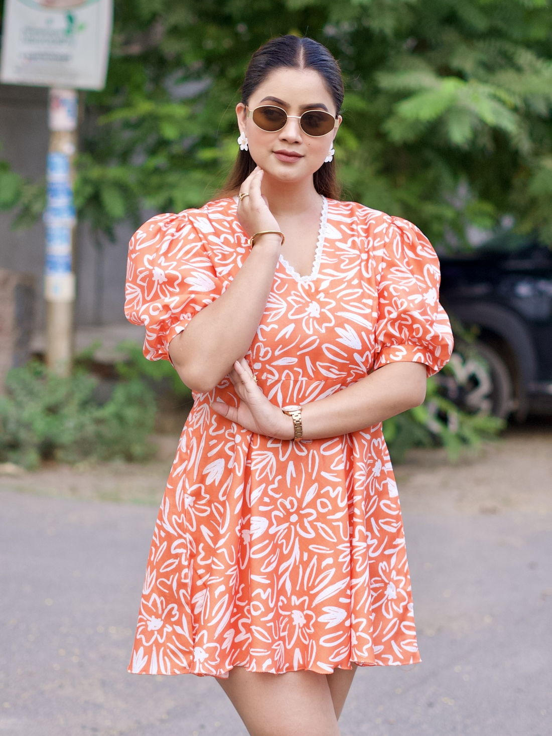 LINEN ORANGE FLORAL PRINT FIT & FLARE TOP
