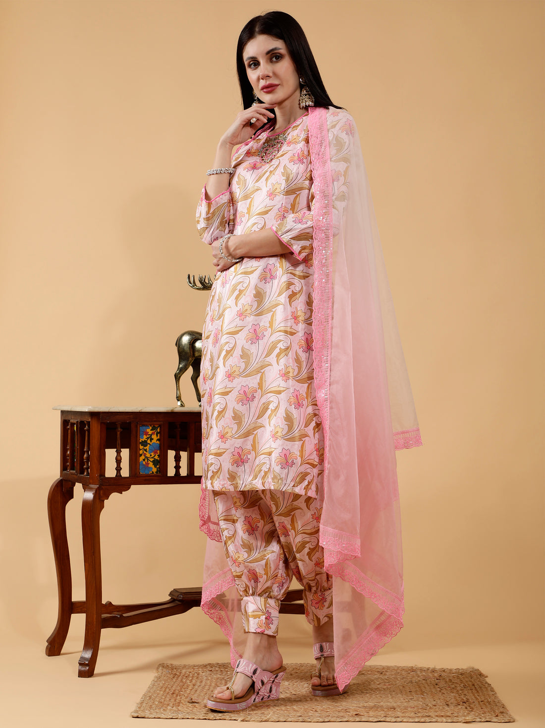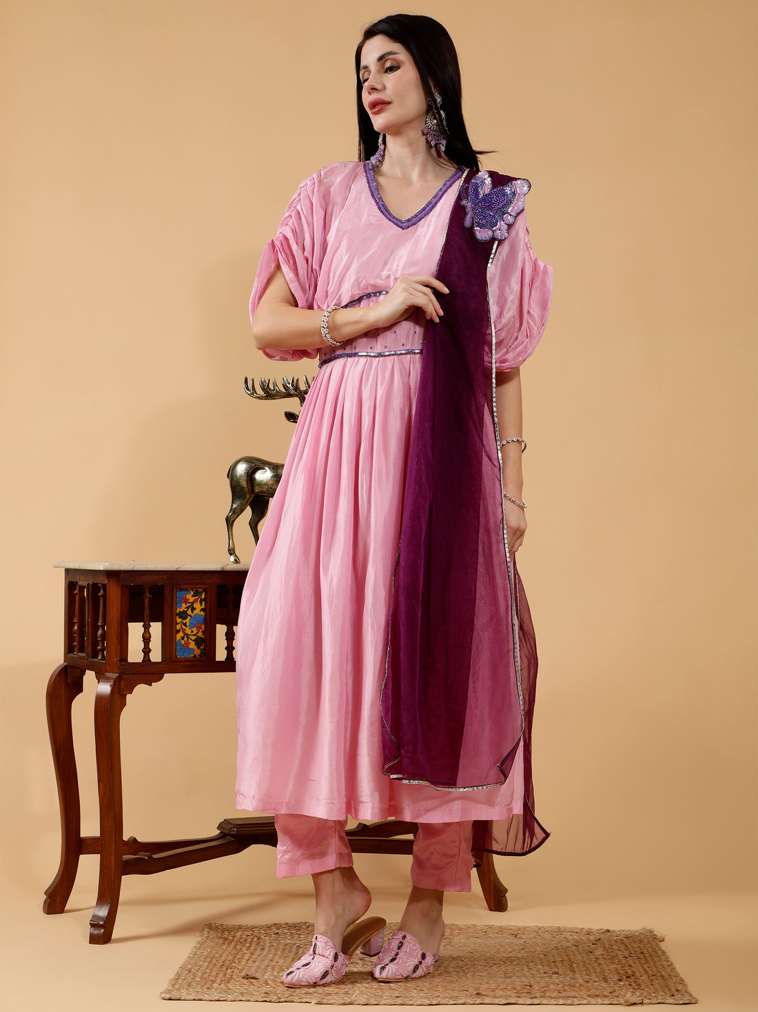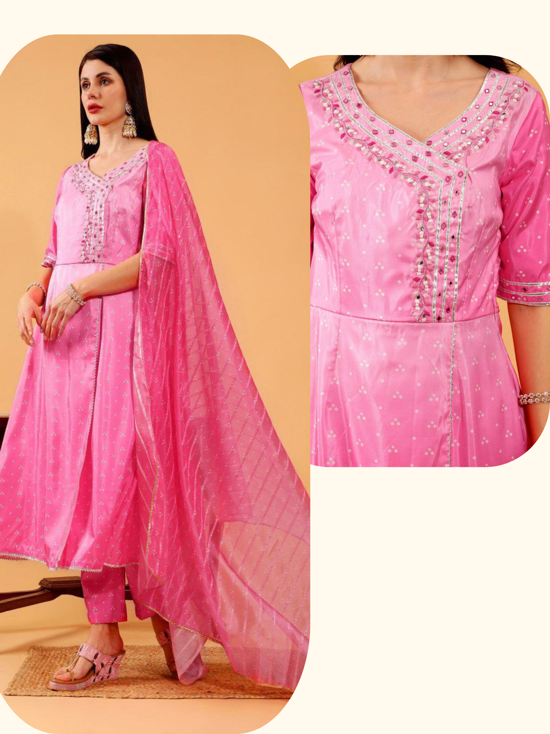 Silk 3 Pc Suit Set Printed Chetna Ombre Pink Bandhani Hand Embroidered