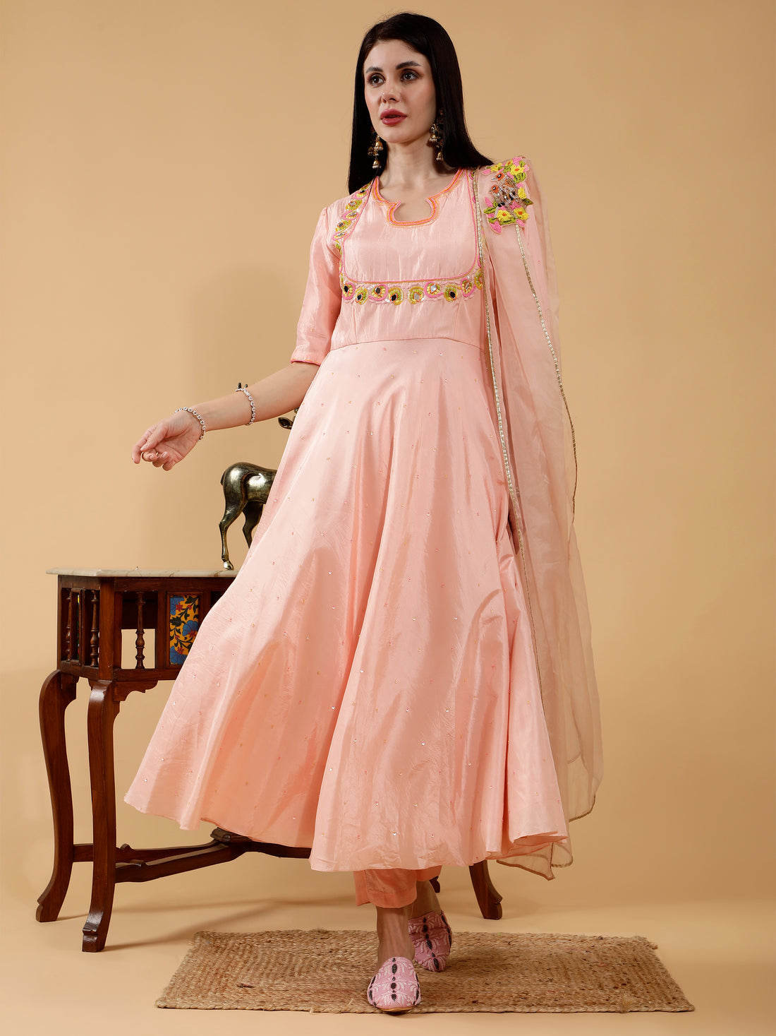 Silk 3 Pc Suit Set Chhaya Peach Hand Embroidered