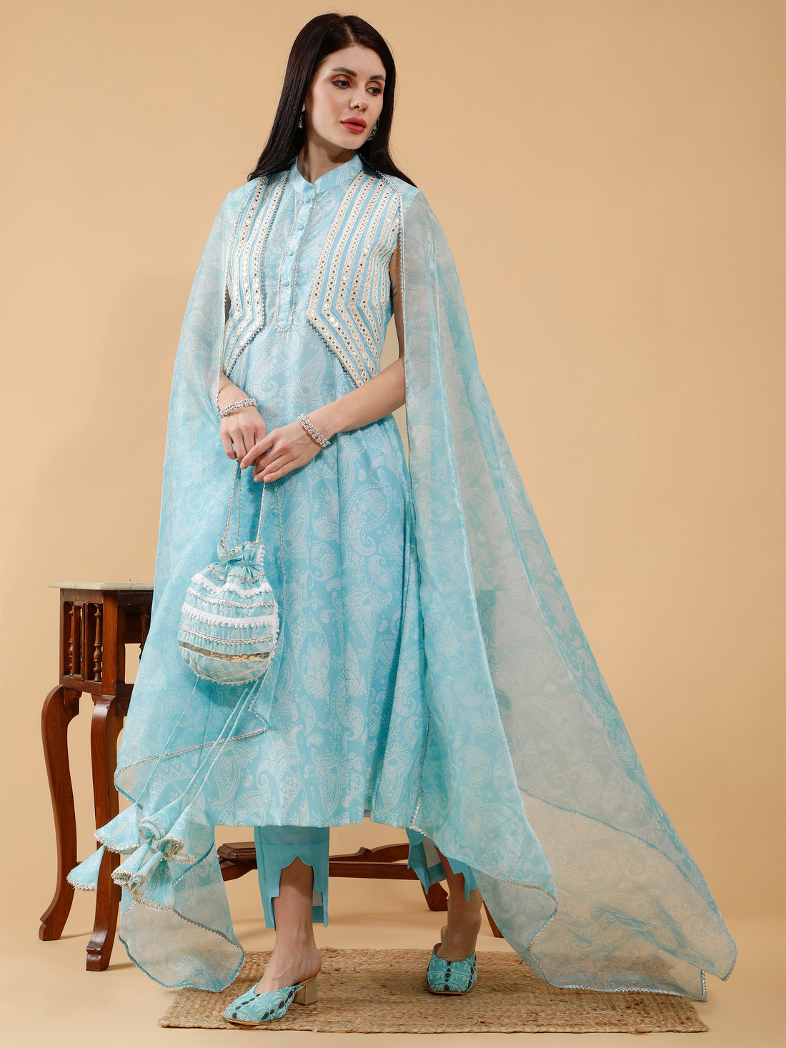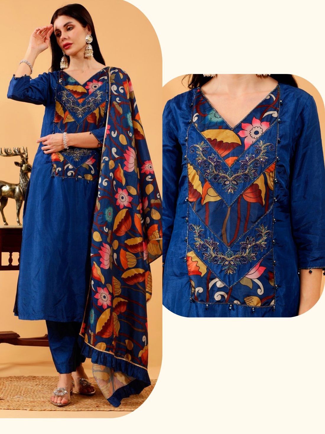 Silk 3 Pc Suit Set in Benika Blue Printed with Hand Embroidered