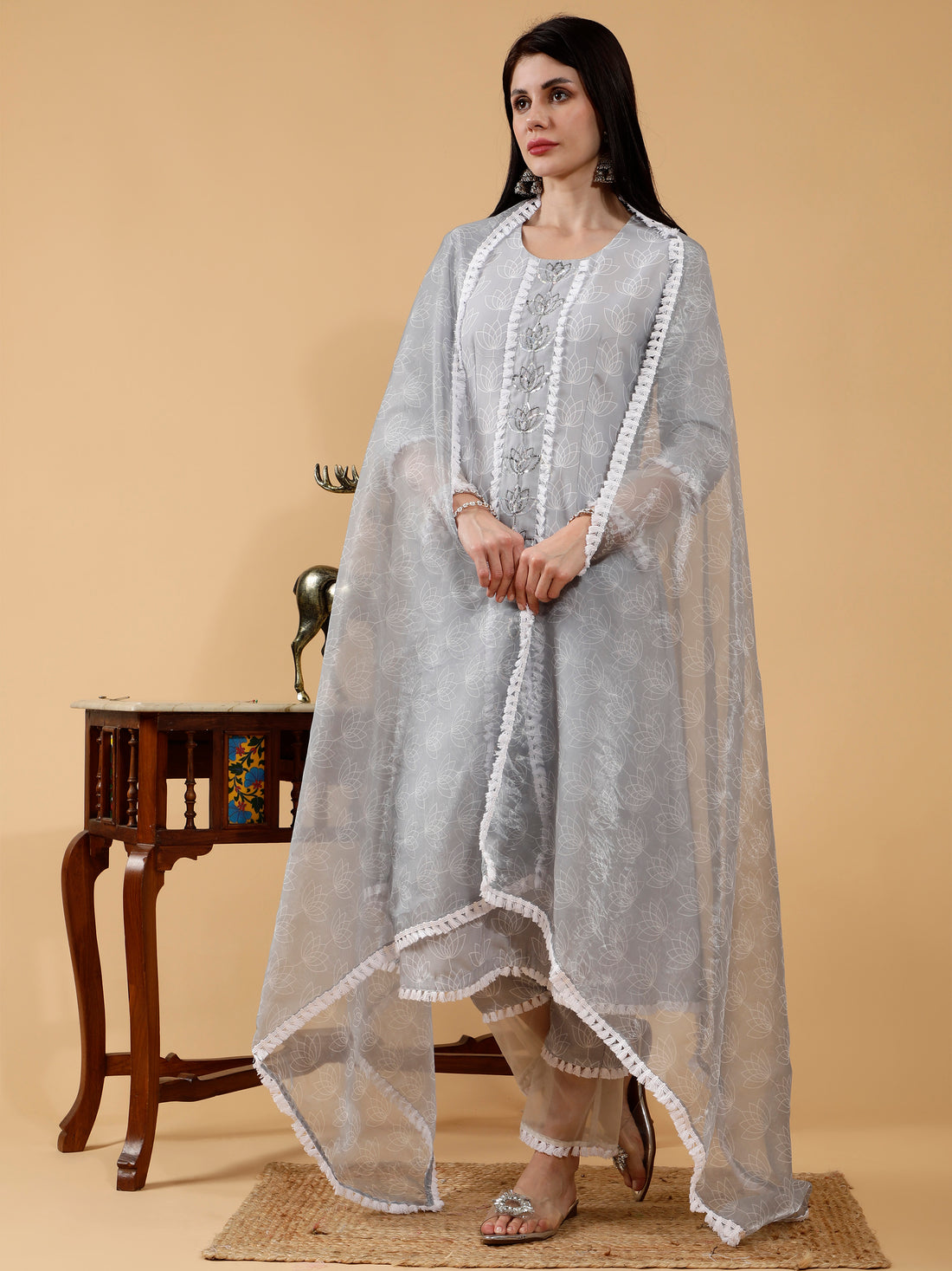 Shyla Light Grey Lotus Print Hand Embroidered 3 Piece Suit Set