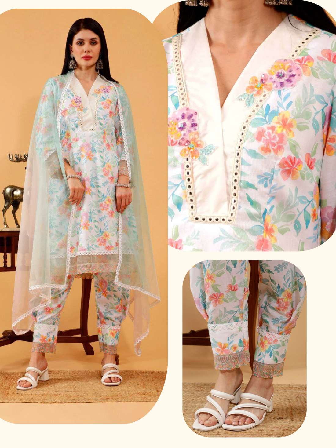 WHITE & GREEN FLORAL 2 PIECE LINEN KURTA SET