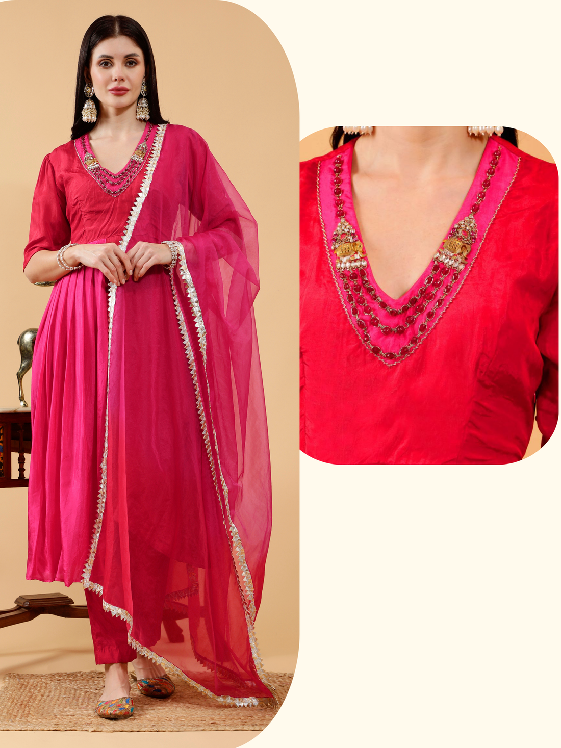 Silk 3 Pc Suit Set in Chandani Red & Hot Pink Hand Embroidered