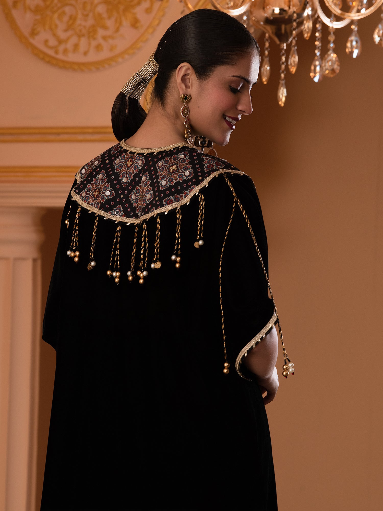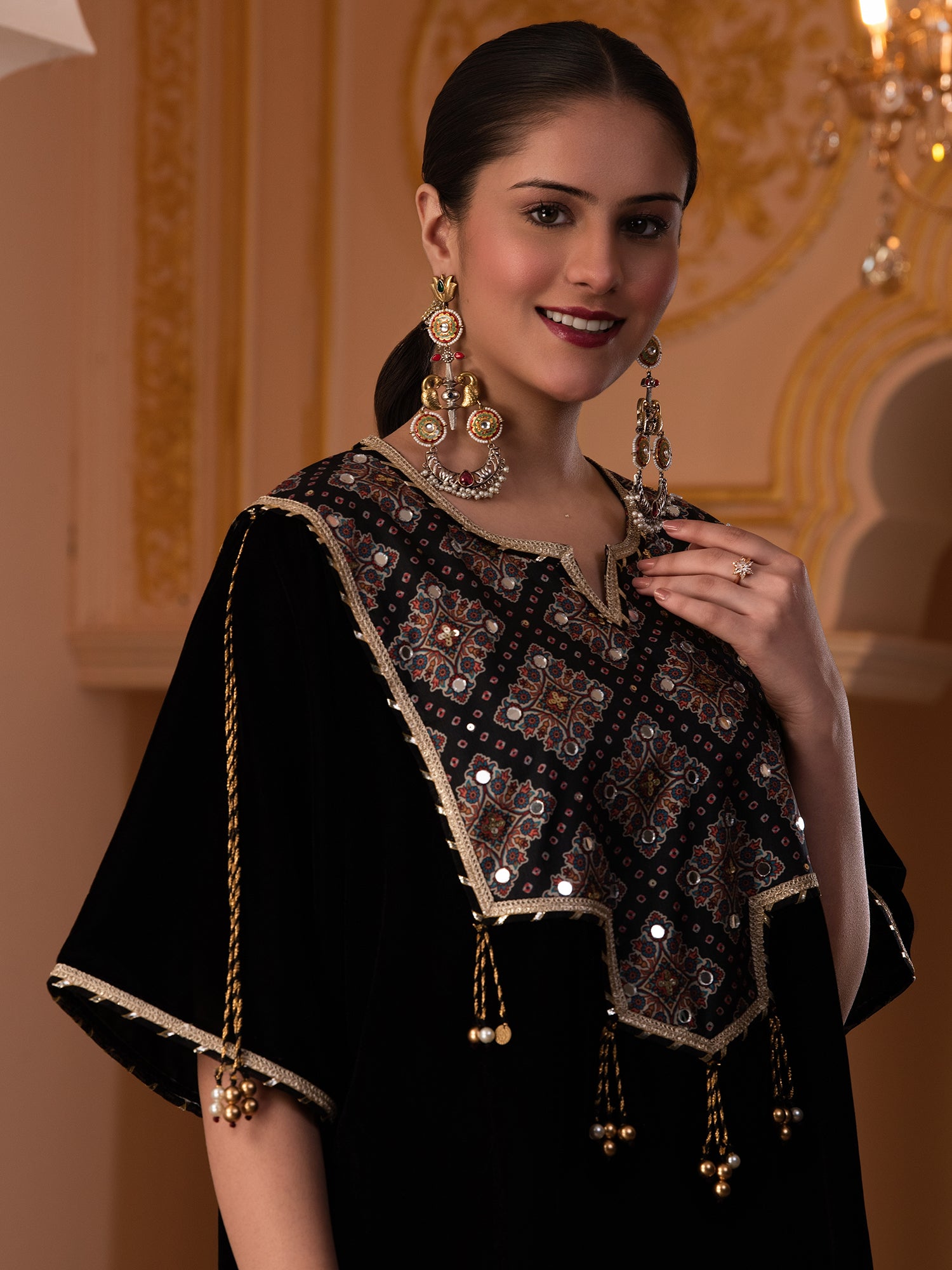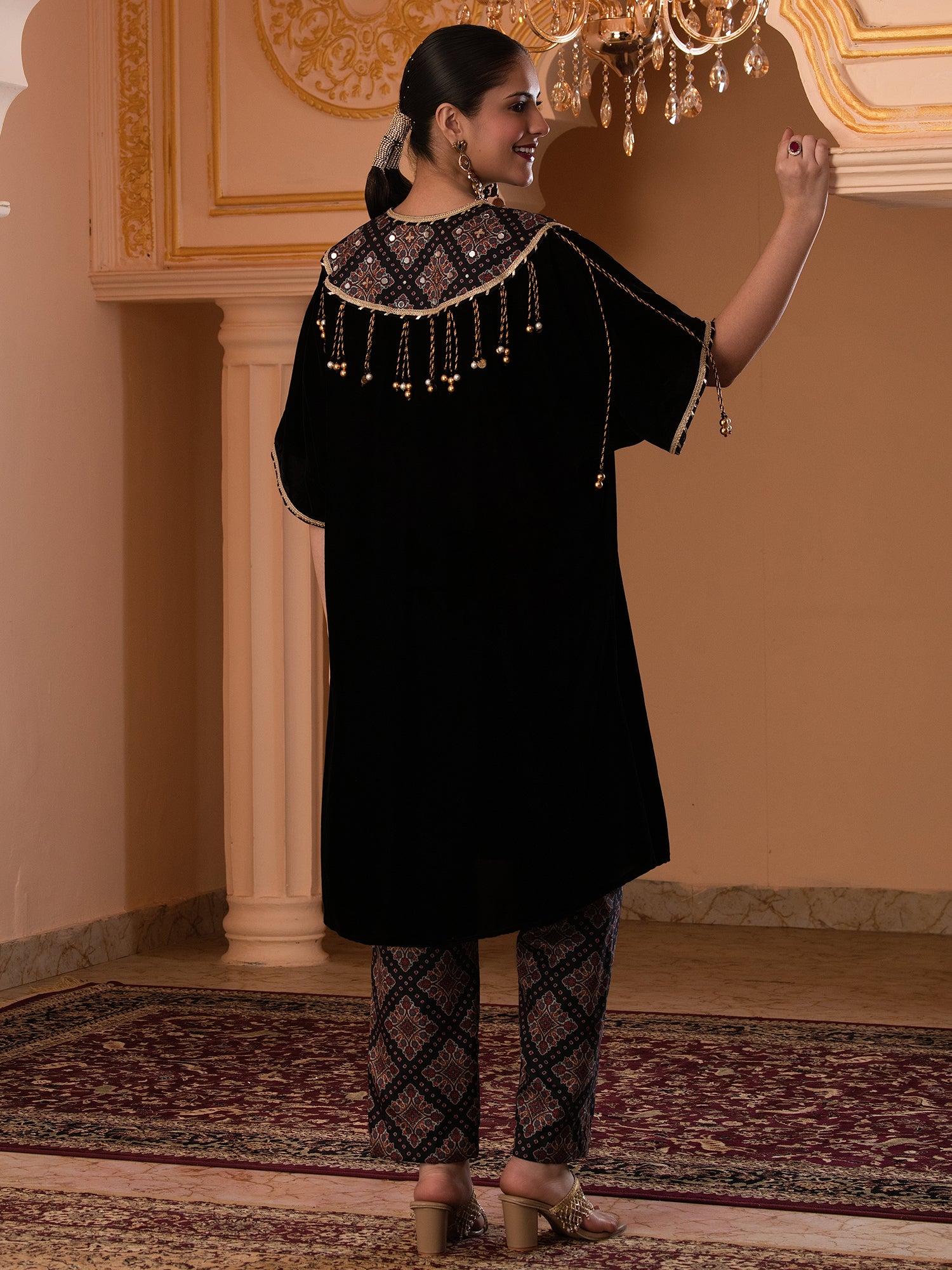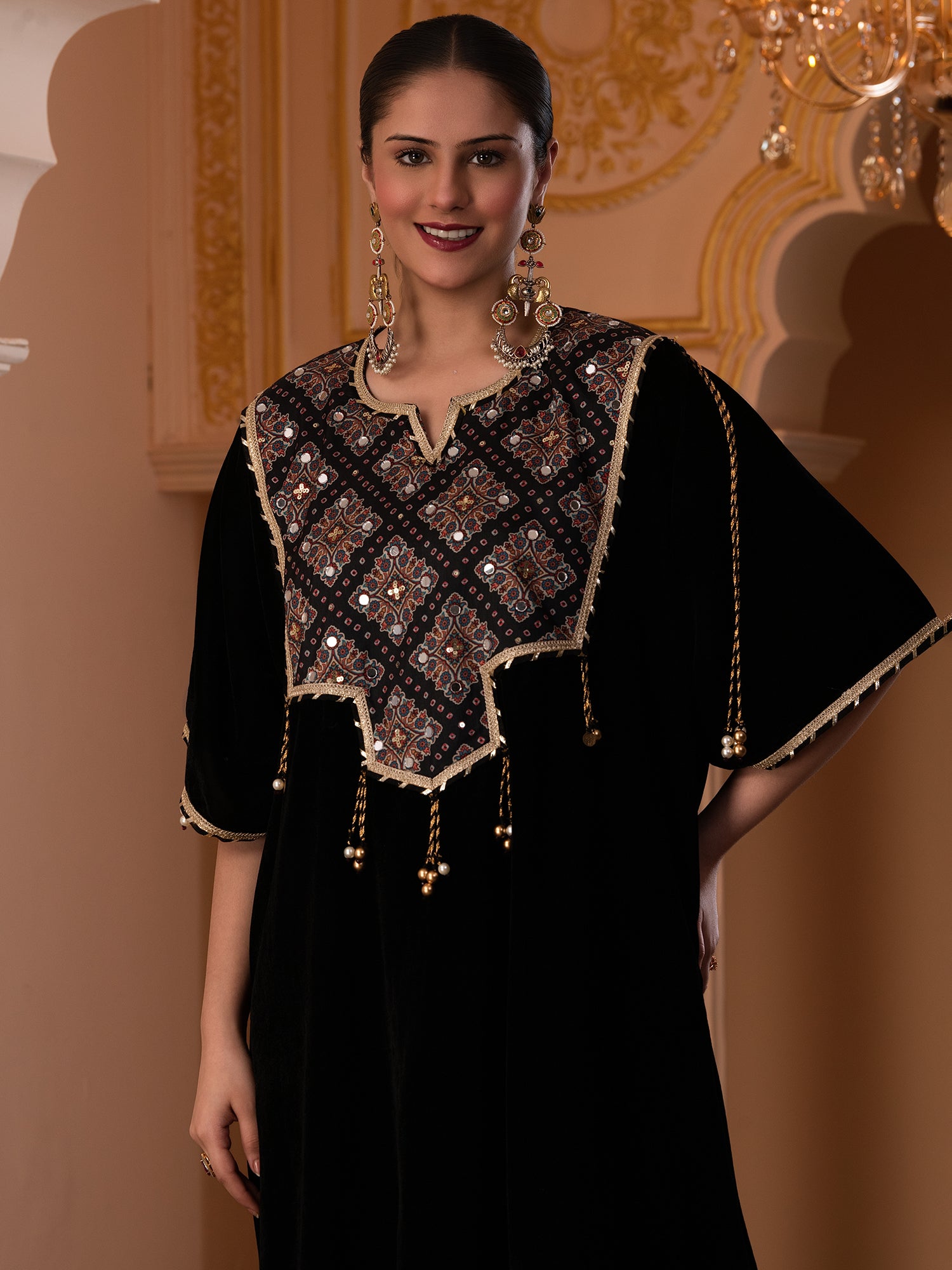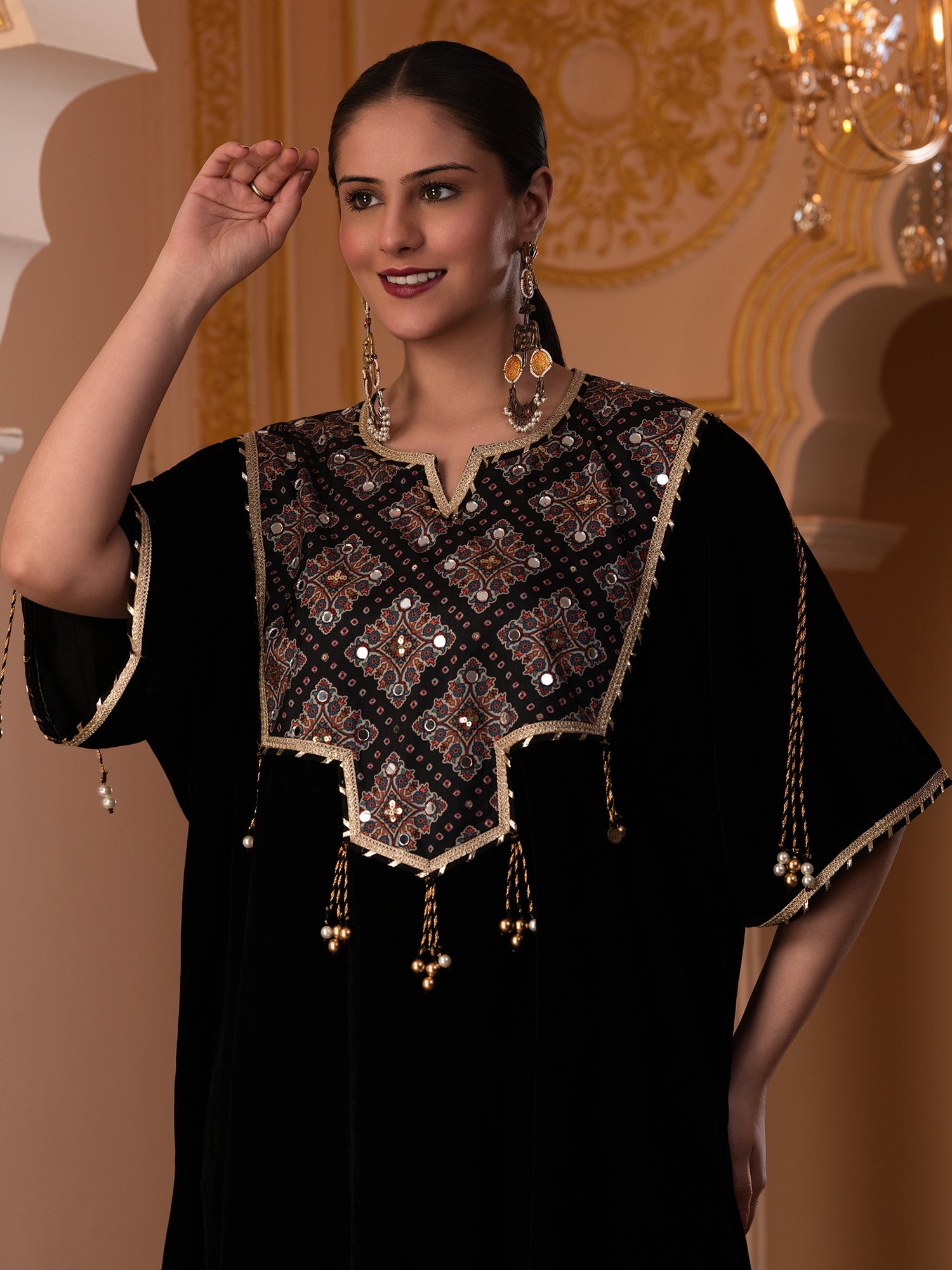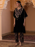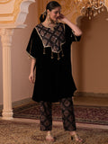 Description - Premium & luxurious Velvets are a go to silhouettes for Winter Weddings and parties. This pretty kaftan in Black color adorned with printed neck yok highlighted with sequences is a must have in your Winter Wardrobe to keep you looking in vogue yet keeping you warm & cozy. It is paired with plazzo pants to complete the look.