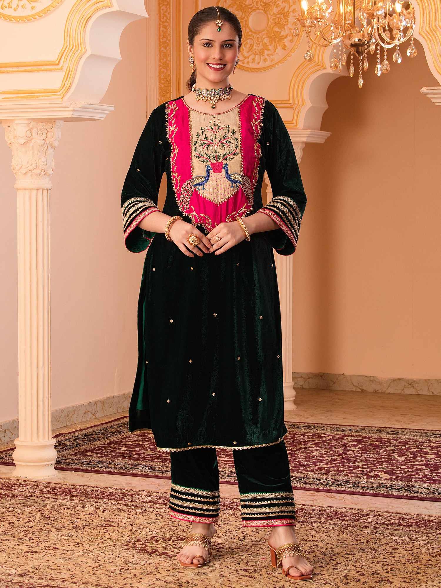 Description - Premium & luxurious Velvets are a go to silhouettes for Winter Weddings and parties. This pretty straight suit in beautiful Bottle Green with Hand Embroidered Neck Yok by our hardworking artisans is a must have in your Winter Wardrobe to keep you looking in vogue yet keeping you warm & cozy. Zoom in to fall in love with the beauty of Hand Embroidery. It has bell sleeves with hand embellishments and adorned with beautiful laces. It is paired with straight pants to complete the look.