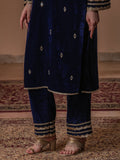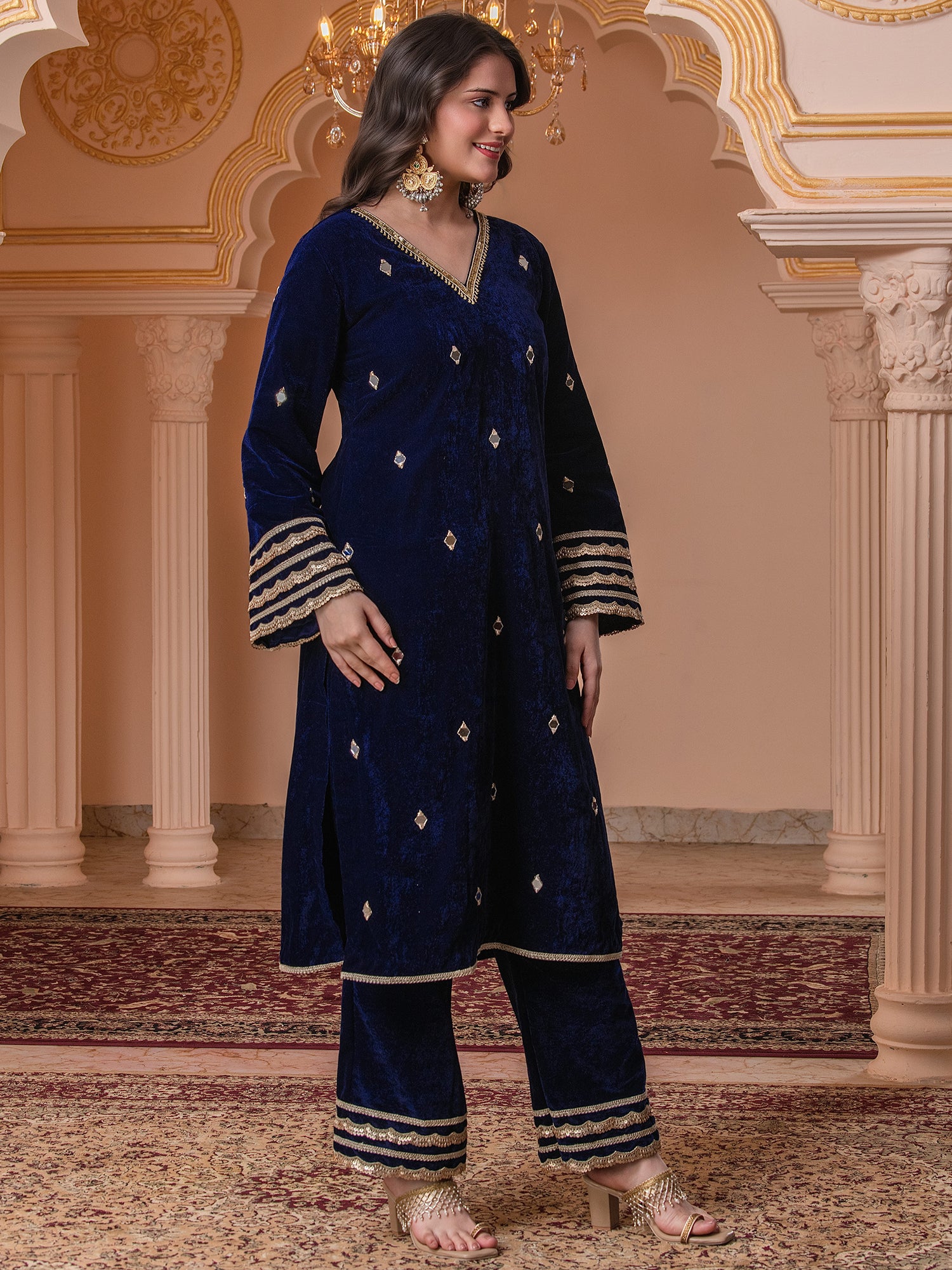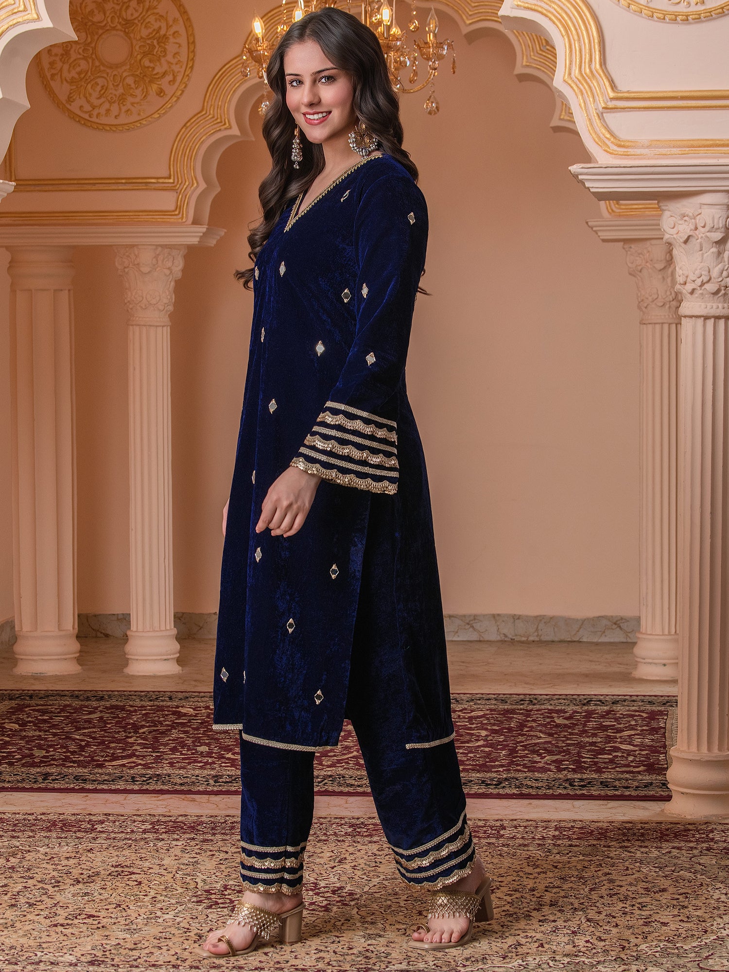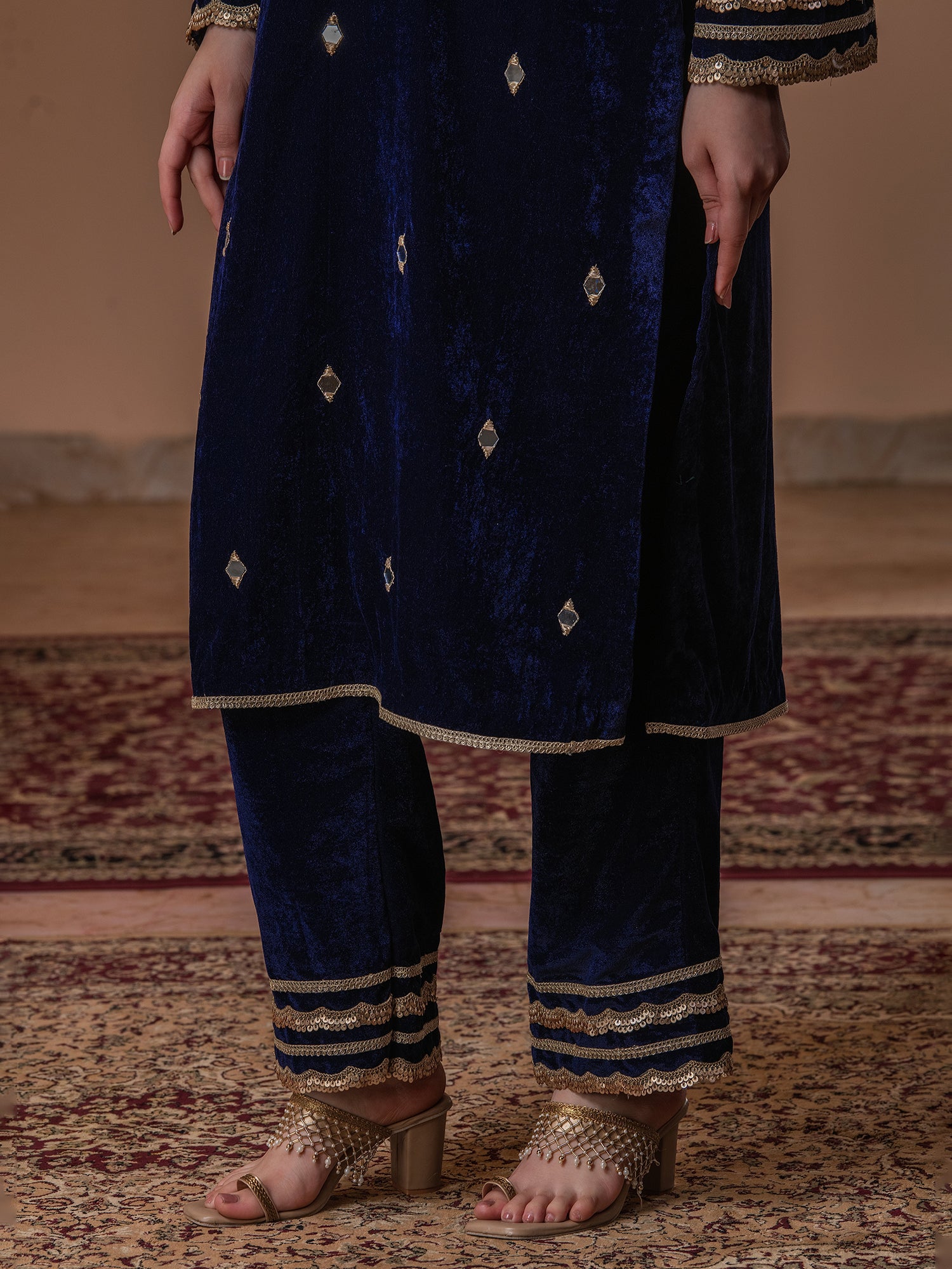Description - Premium & luxurious Velvets are a go to silhouettes for Winter Weddings and parties. This pretty straight suit in beautiful Navy blue adorned with Original Mirror Work all over the kurta by our hardworking artisans is a must have in your Winter Wardrobe to keep you looking in vogue yet keeping you warm & cozy. It has bell sleeves with Mirror work embellishments and adorned with beautiful laces. It is paired with straight pants to complete the look.
