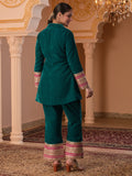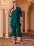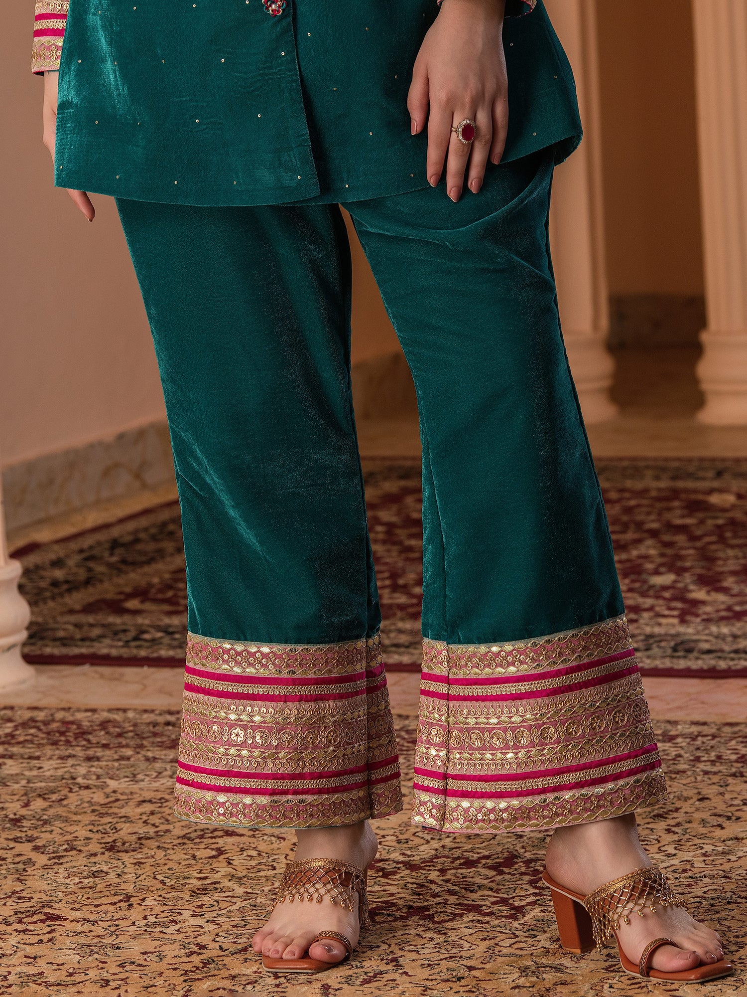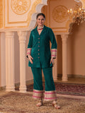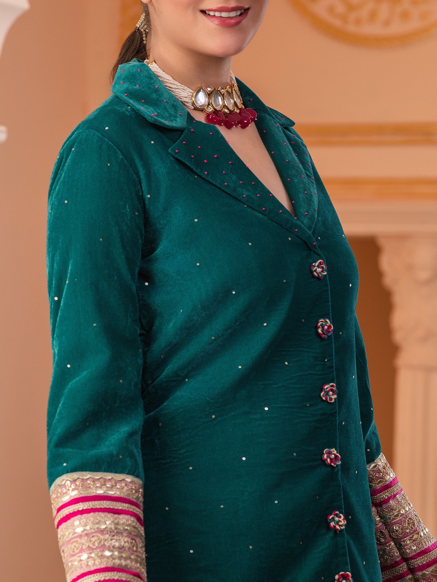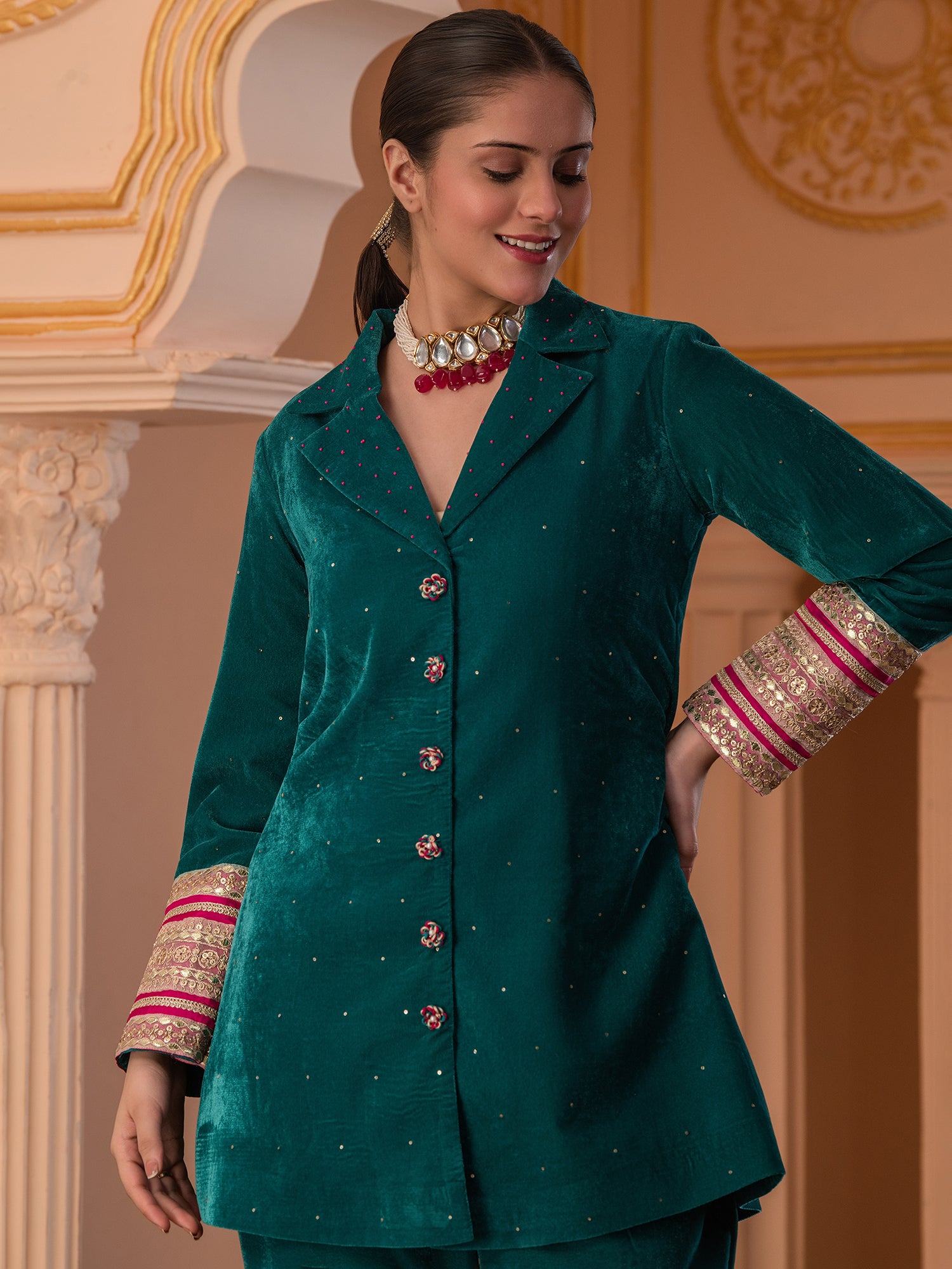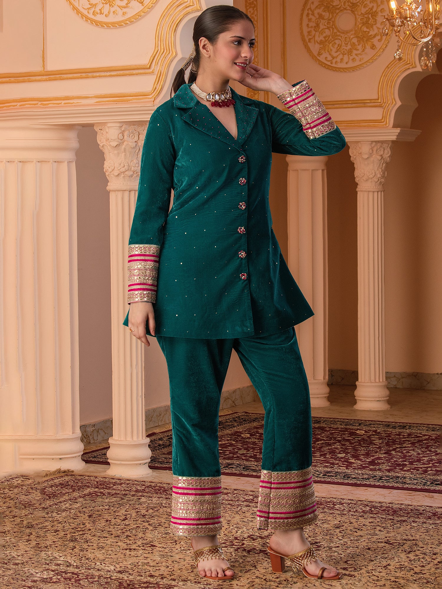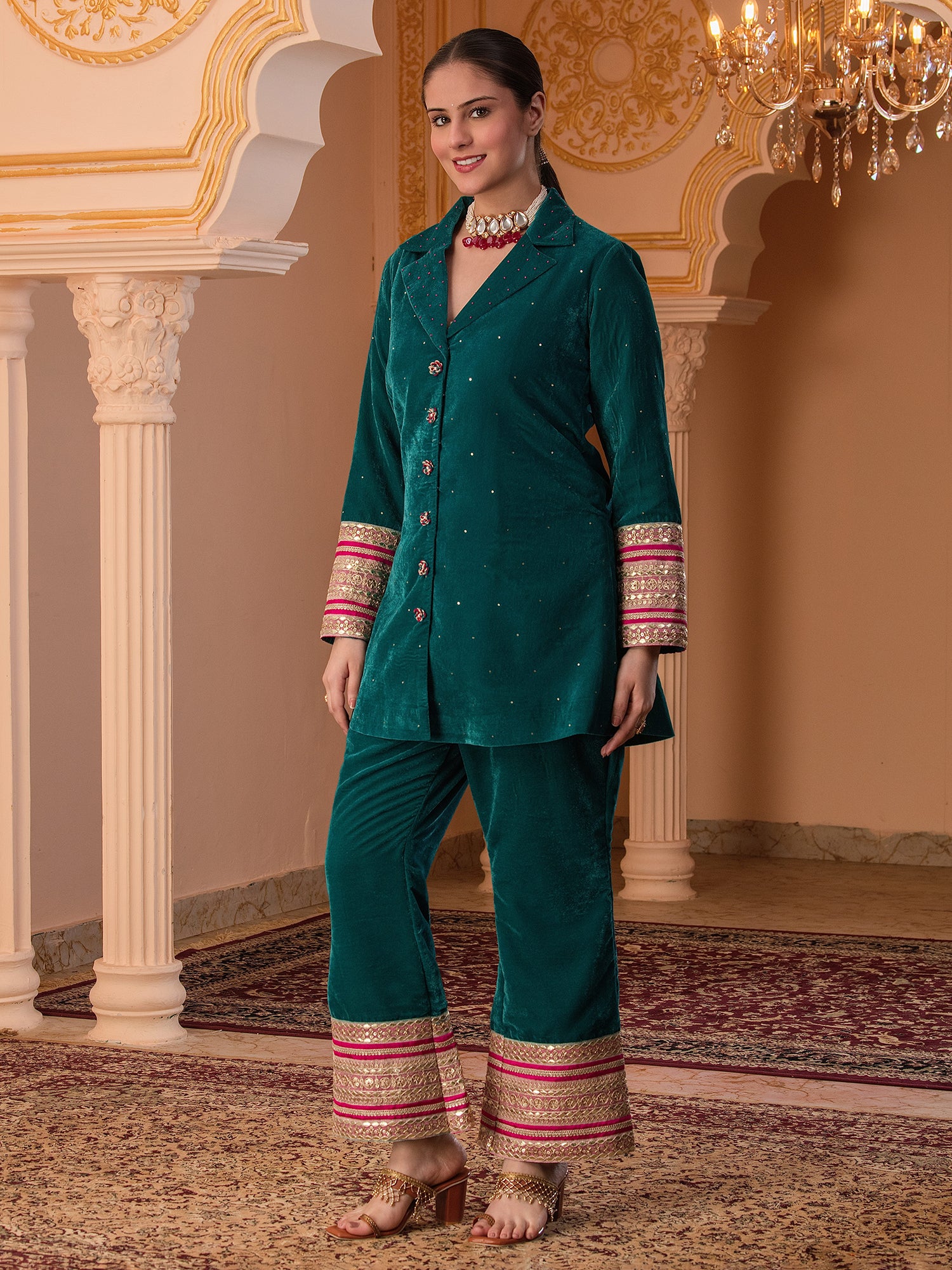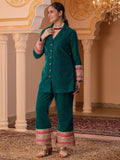 Description - Premium & luxurious Velvets are a go to silhouettes for Winter Weddings and parties. This pretty Blazer Coord in beautiful Teal color adorned with alluring laces is a must have in your Winter Wardrobe to keep you looking in vogue yet keeping you warm & cozy. It has beautiful sleeves adorned with beautiful laces which makes the attire glitzy & glamorous. It is paired with Bell Pants to complete the look.